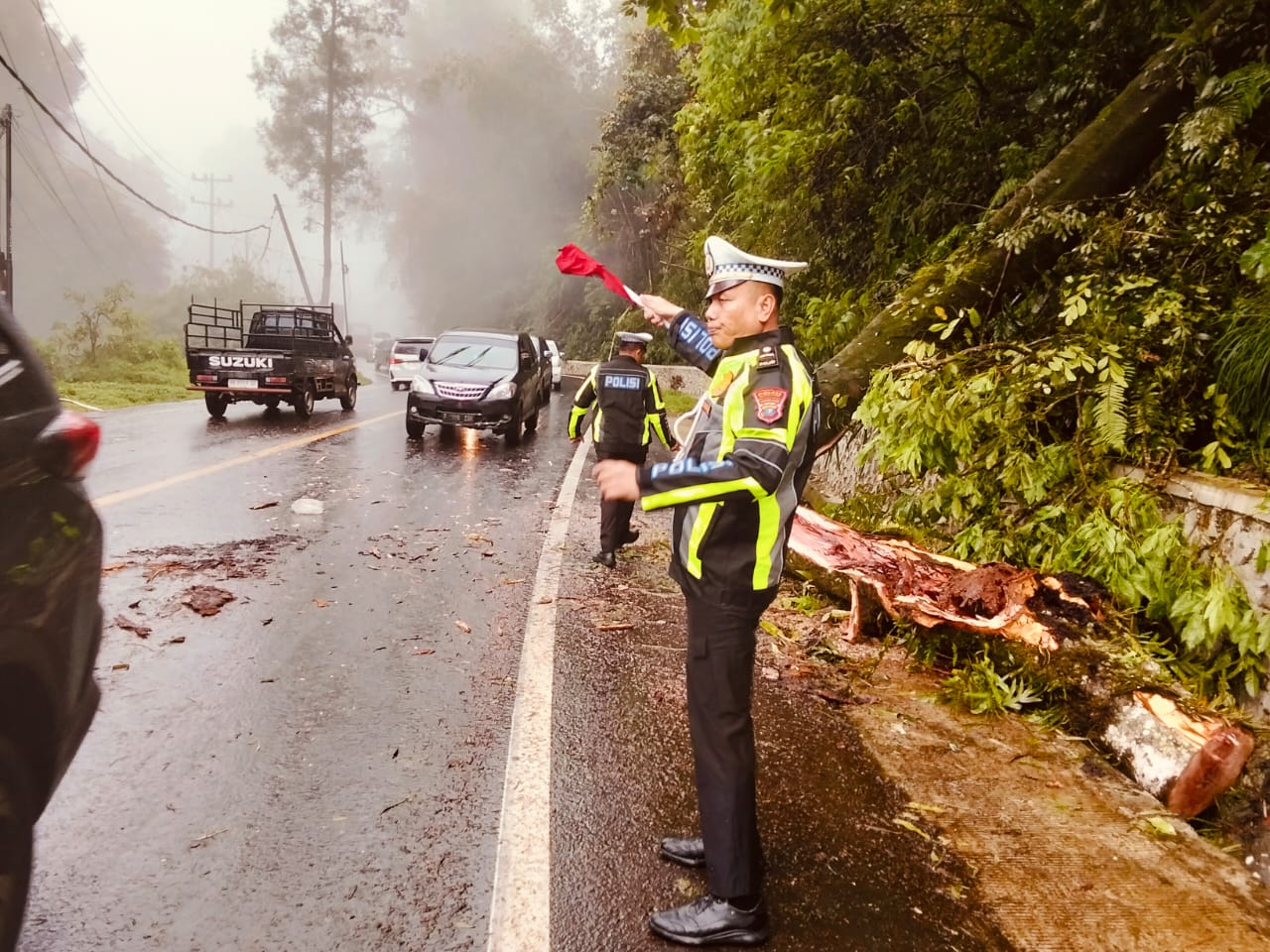 “Pukul 10.30 WIB kendaraan sudah bisa melintas karena evakuasi pohon tumbang dilakukan dengan cepat dan menggunakan bantuan unit mesin Sinswo,” ujar Kapolres.