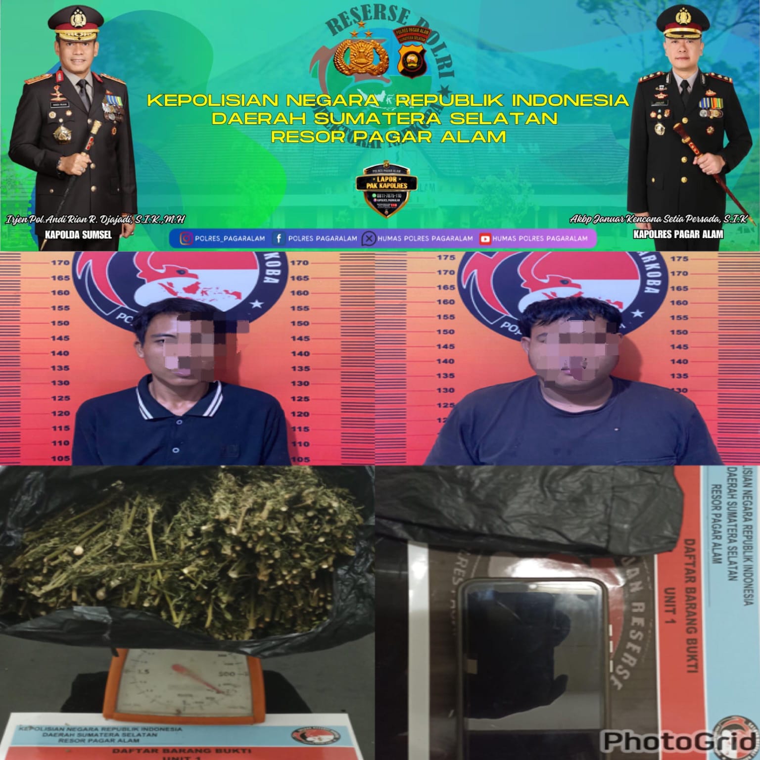 Kasat Narkoba Iptu Doris Pria di, S. H. M.SI menyampaikan telah mengamankan Dua Pria Sebagai Pengedar ganja berinisial SH(27) dan JMP (27) barang bukti ganja seberat 700 gram serta satu unit handphone yang digunakan untuk mejalankan tranksaksi, bermulai dari informasi laporan dari masyarakat, lalu tim satnarkoba melakukan penyelidikan dan langsung menangkap kedua pelaku di kelurahan karang dalo kec Dempo Tengah kota Pagar Alam. Dalam pemeriksaan SH Urine Positif (+) Positif Metafetamin sedangkan JLP Pemeriksaan Urine (-) Negatif pelaku sudah kita amankan dan sudah ditetapkan tersangka melanggar UU 35 tahun 2009 tentang Narkotika
