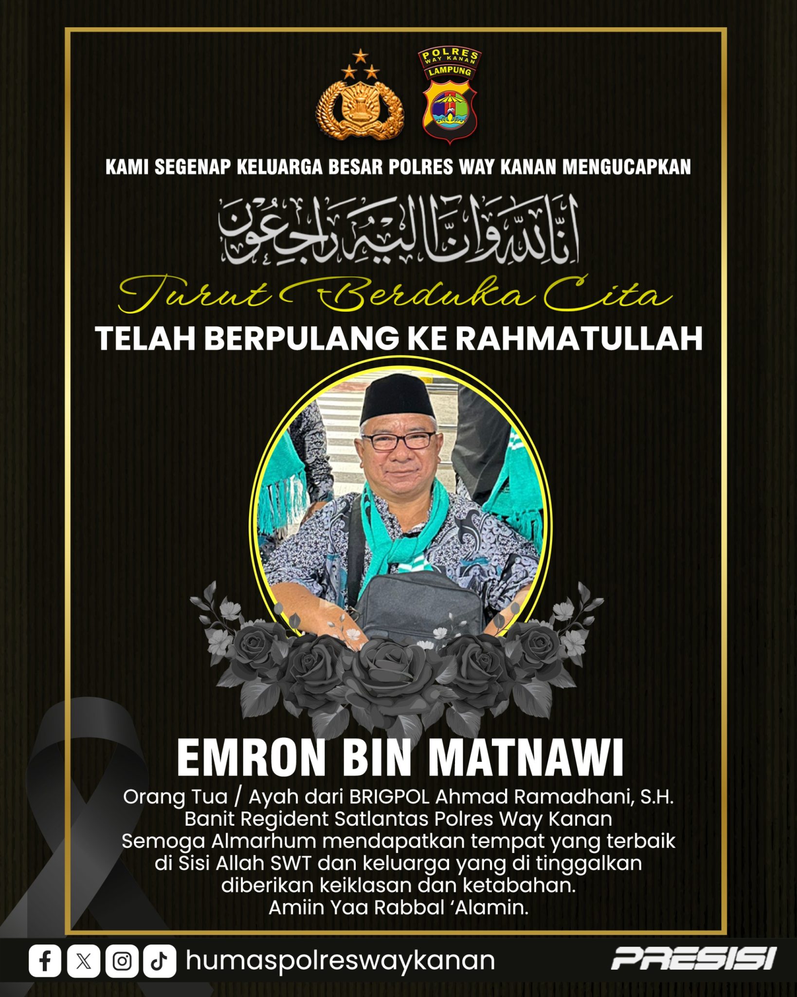 mendalam atas wafatnya Almarhum Emron bin Matnawi. Semoga amal ibadahnya diterima Allah SWT, diampuni dosa-dosanya dan keluarga yang ditinggalkan diberi kesabaran dan ketabahan,” ujar Kapolres Way Kanan AKBP Adanan Mangopang melalui Kasatlantas AKP Asep Suhendi saat diruang kerja Rabu (05/02/2025).