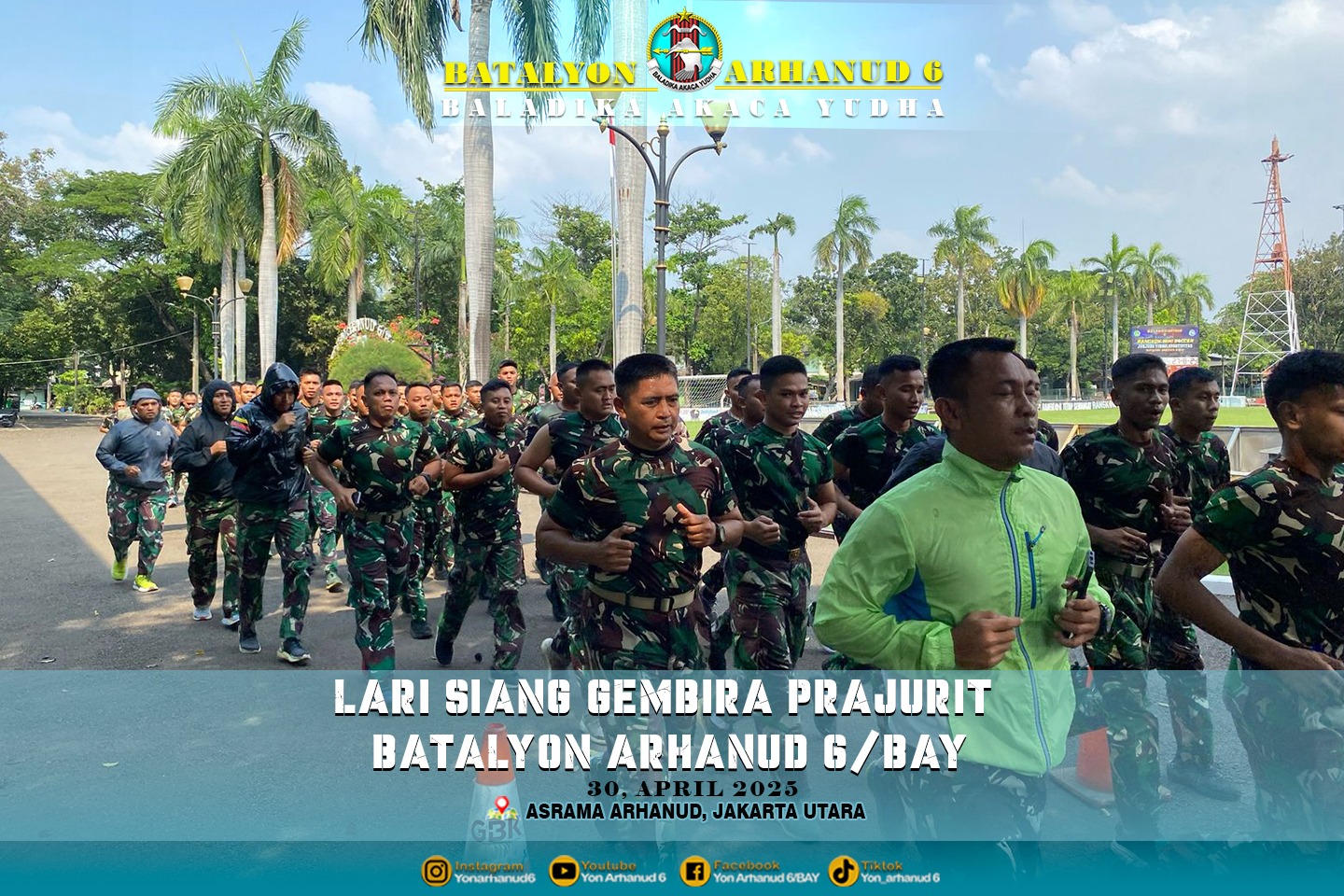 StarindoNews.com JAKARTA — Batalyon Arhanud 6/BAY Melaksanakan kegiatan lari siang gembira bersama Dalam rangka menjaga kebugaran fisik serta mempererat soliditas antar prajurit, Rabu siang (30/04/2025).