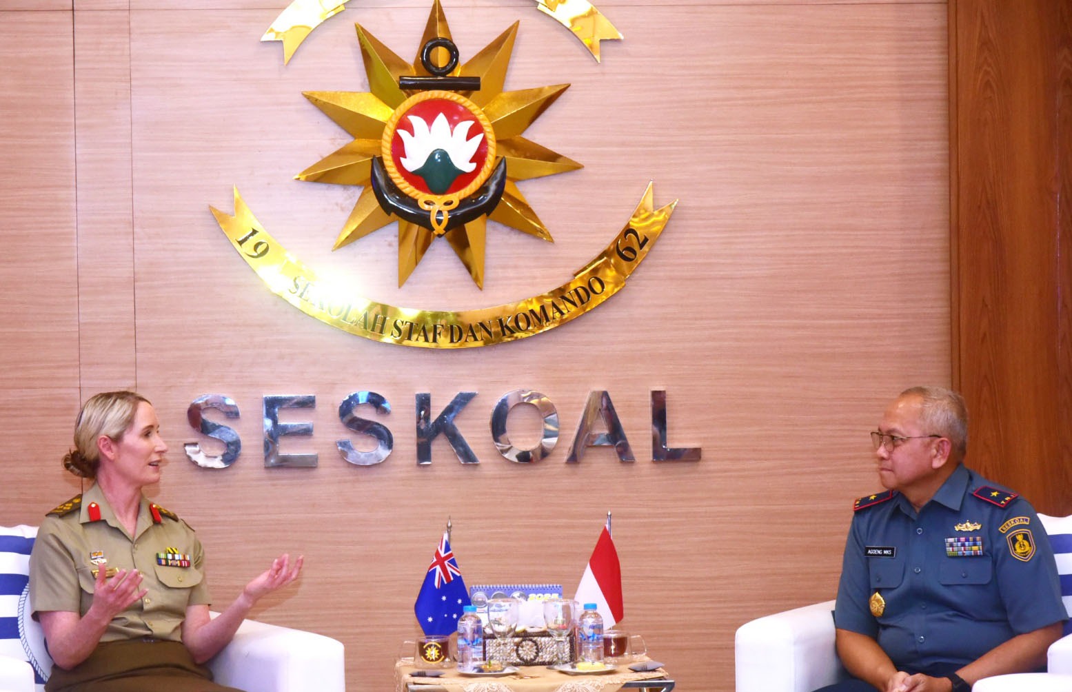 StarindoNews.com JAKARTA — Komandan Sekolah Staf dan Komando Angkatan Laut (Danseskoal) Laksamana Muda TNI Ariantyo Condrowibowo yang diwakili Wadan Seskoal Laksamana Pertama TNI Agoeng MKS menerima kunjungan Commandant Australian War Collage Brigadier Lara Terrese Troy di Seskoal, Cipulir, Kebayoran Lama, Jakarta Selatan, Senin (14/7/2025).