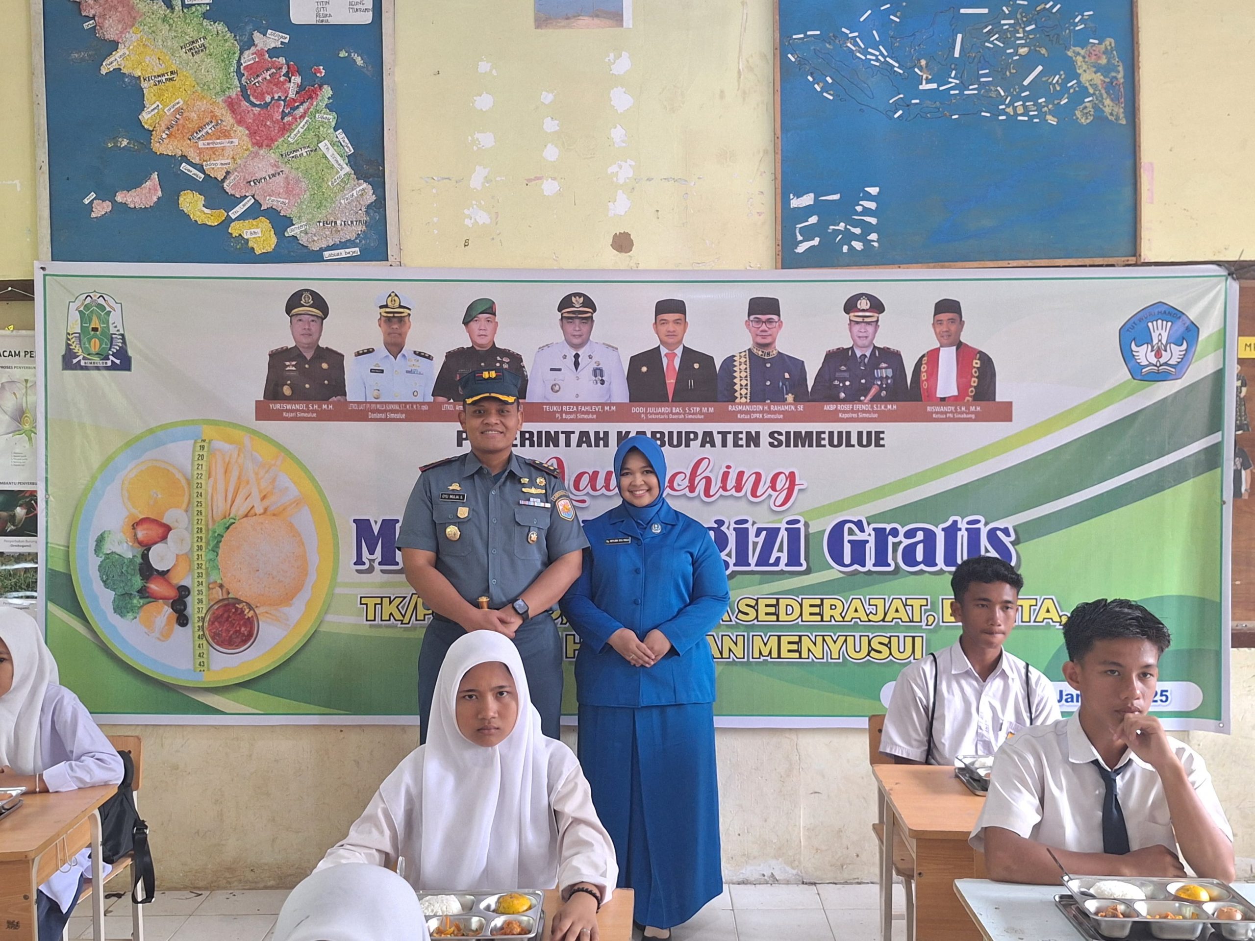 StarindoNews.com SIMEULUE — Komandan Pangkalan TNI AL Simeulue Letkol Laut (P) Oyu Mulia Sukmana, S.T., M.T., M.Tr. Opsla., didampingi Ketua Jalasenastri Cabang 8 Korcab l DJA l Ny. Meylina Oyu Mulia menghadiri kegiatan peluncuran perdana Program Makan Bergizi Gratis (MBG) di Kabupaten simeulue. Acara ini menjadi langkah awal dari program pemerintah pusat ke daerah yang bertujuan meningkatkan kualitas gizi masyarakat, khususnya bagi anak-anak usia sekolah dan ibu hamil.