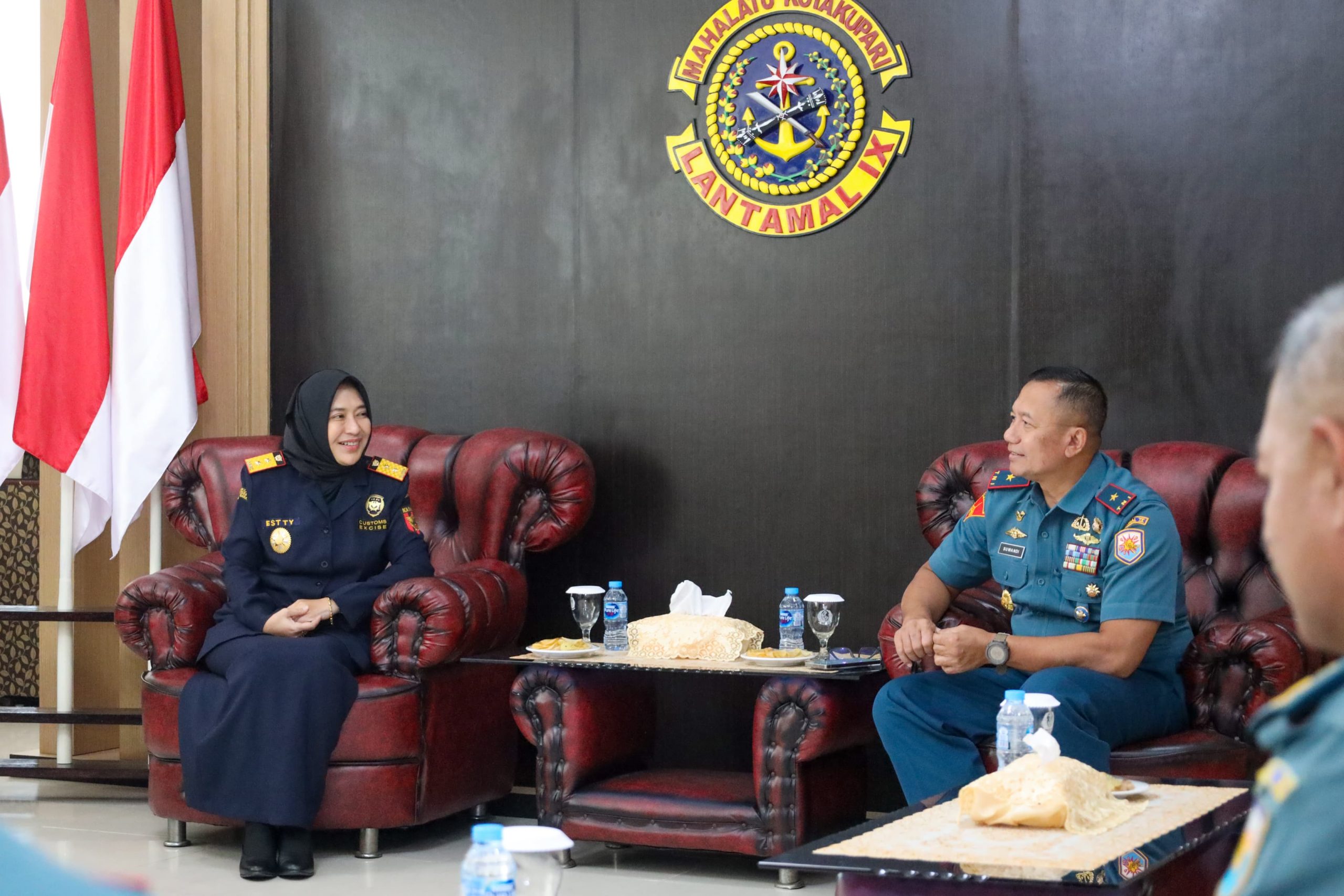 Brigjen TNI (Mar) Suwandi didampingi Aslog Danlantamal IX, Danpomal Lantamal IX, Danyonmarhanlan IX, dan Dantim Intel Lantamal IX menerima kunjungan dari Kepala Kantor Bea dan Cukai bersama tim. Rombongan Bea Cukai yang dipimpin oleh Ibu Essty Purwadiani Hidayatie, S.Si., M.Si., Ph.D., selaku Kepala Kantor Wilayah Bea Cukai bersama tim yaitu Kepala Bidang Penindakan dan Penyidikan, Kepala Seksi Intelijen, dan Kepala Seksi Penindakan I melaksanakan kunjungan silaturahmi ke Lantamal IX Ambon.
