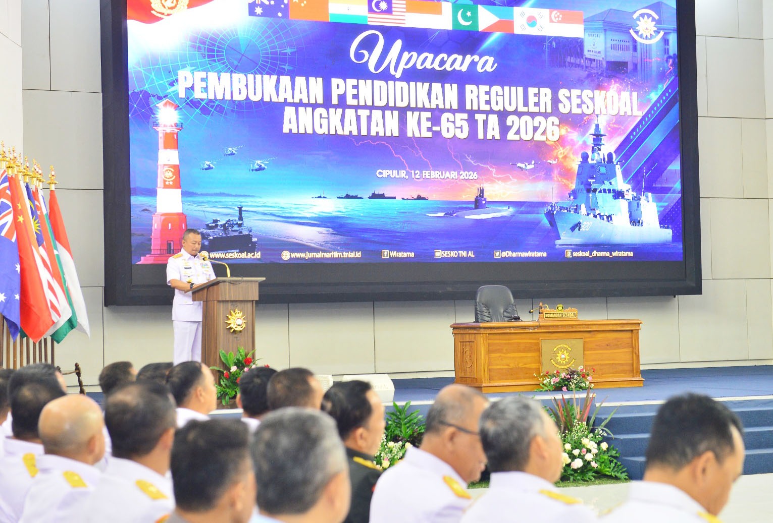 StarindoNews.com JAKARTA —- Kepala Staf Angkatan Laut (Kasal) Laksamana TNI Dr. Muhammad Ali, S.E., M.M., M.Tr.Opsla. diwakili oleh Komandan Sekolah Staf dan Komando Angkatan Laut (Danseskoal) Laksamana Muda TNI Ariantyo Condrowibowo bertindak sebagai Inspektur Upacara (Irup) pada Upacara Pembukaan Pendidikan Reguler (Dikreg) Seskoal angkatan ke-65 TA 2026, bertempat di auditorium Jos Soedarso Seskoal, Cipulir, Kebayoran Lama, Jakarta Selatan, Kamis (12/02/2026).