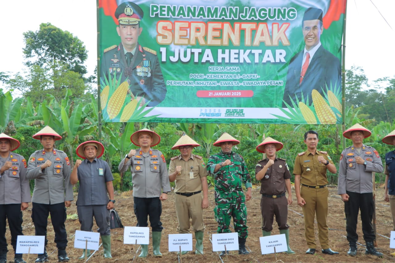 StarindoNews.com TANGGAMUS — Dalam rangka mendukung program ketahanan pangan nasional yang digagas Presiden Prabowo Subianto, Polres Tanggamus bekerja sama dengan Pemerintah Kabupaten Tanggamus menggelar penanaman jagung di lahan seluas 1,5 hektar di wilayah Talang Padang.