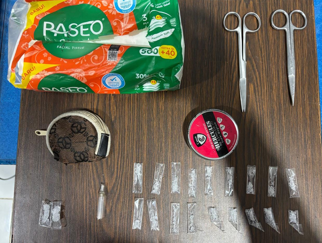 Dalam penggerebekan tersebut, petugas menyita sejumlah barang bukti, di antaranya; 18 (delapan belas) paket plastik bening berisikan kristal putih diduga narkotika jenis sabu dengan berat bruto 2,89 gram (bruto); 2 (dua) paket plastik bening berisikan kristal putih diduga narkotika jenis sabu dengan berat bruto 1,11 gram (bruto); 1 (satu) buah kaca pirex; dan 2 (dua) buah gunting.