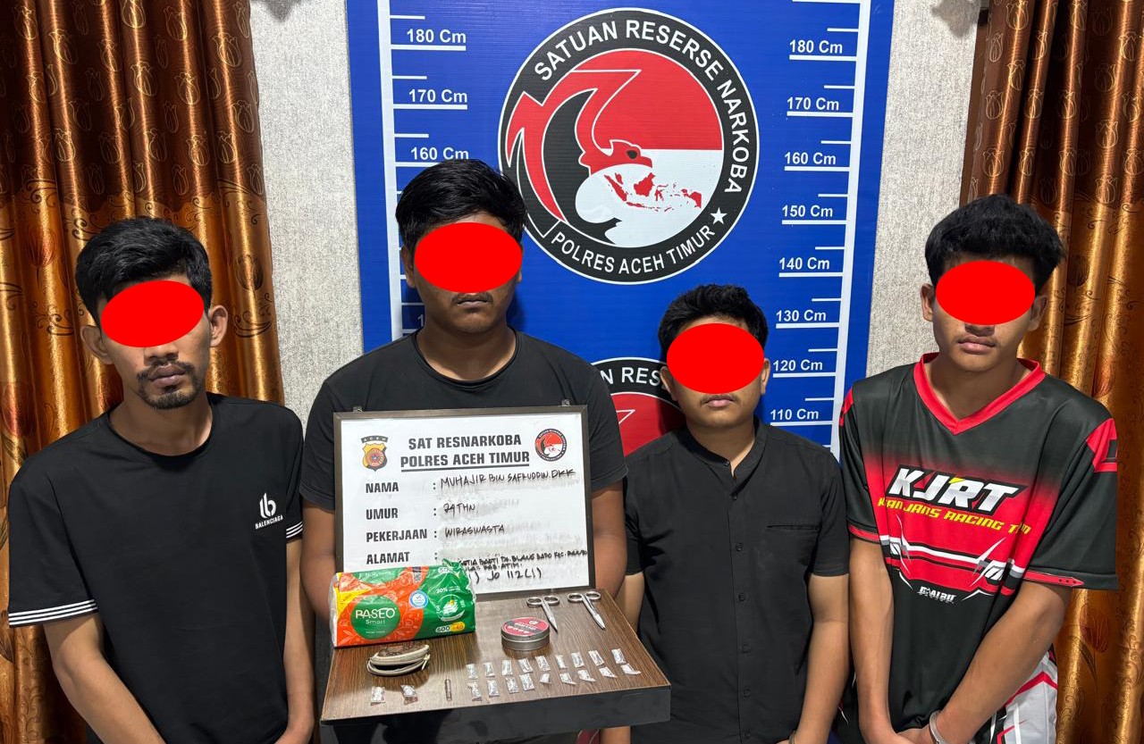 Kasatresnarkoba Polres Aceh Timur, AKP Yusra Aprilla, S.H.,M.H. Senin, (13/01/2025) mengungkapkan keempat pelaku yang diamankan diantaranya berinisial; MU (26), SA (26), FA (23) dan MR (17) yang kesemuanya tercatat warga Kecamatan Ranto Peureulak.