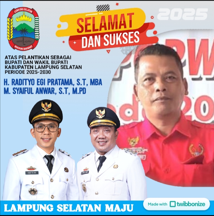 www.Starindonews.com.Lampung Selatan,- Sekretaris DPC PWRI Lampung Selatan Mengucapkan Selamat Kepada H.Radityo Egi Pratama,S.T.,M.B.A dan Muhammad Syaiful Anwar,S.T.,M.Pd.Dilantik Sebagai Bupati dan Wakil Bupati Lampung Selatan Periode 2025-2030.