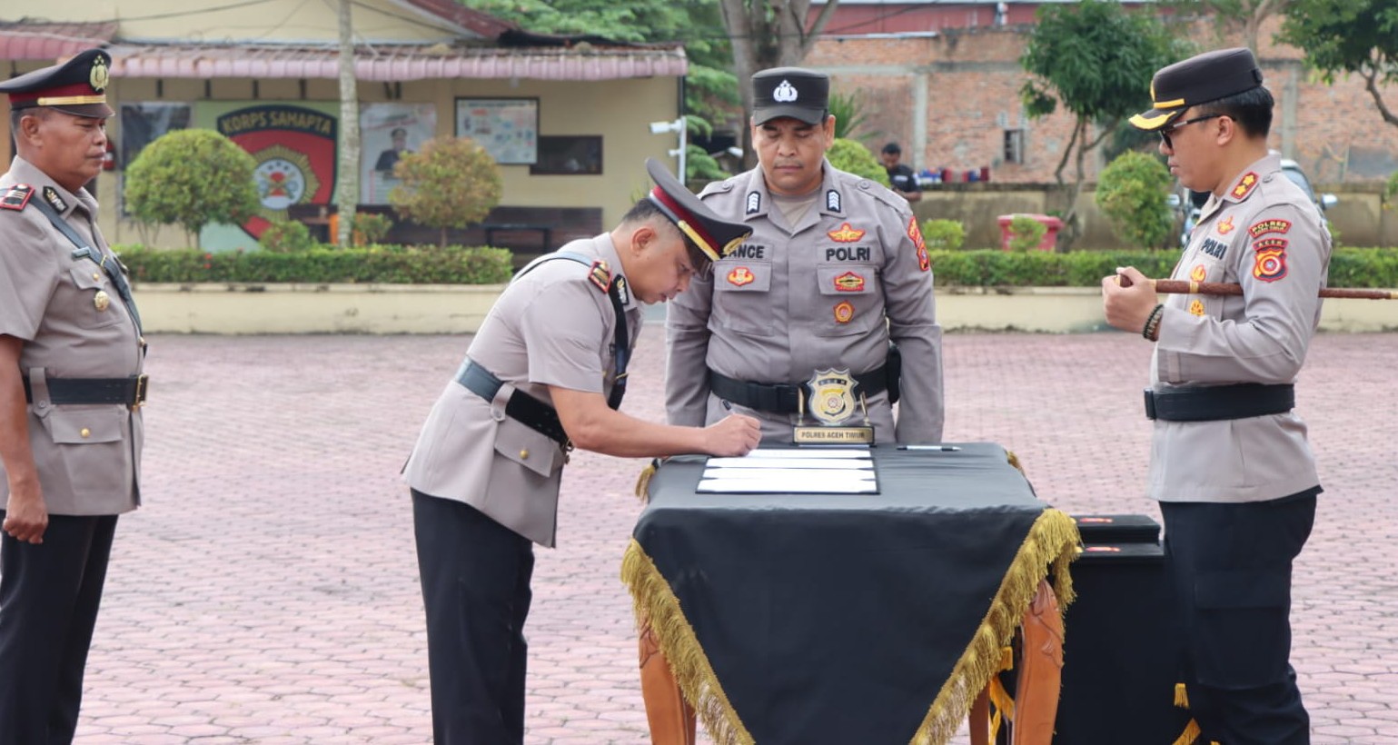 Kapolres Aceh Timur AKBP Nova Suryandaru, S.I.K. memimpin serah terima, termasuk melantik AKP Dasril, S.E. sebagai Ps. Kabag SDM Polres Aceh Timur.