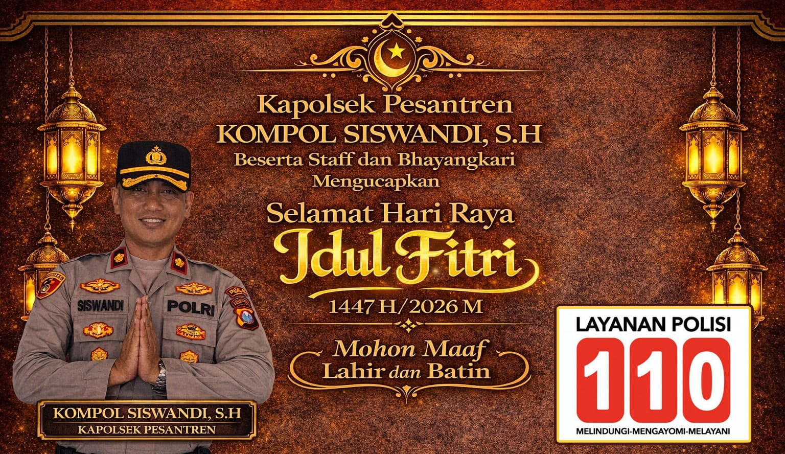 STARINDONEWS.COM | KEDIRI KOTA – Kapolsek Pesantren, Kompol Siswandi, S.H., menyampaikan ucapan Selamat Hari Raya Idul Fitri 1447 Hijriah/2026 Masehi kepada seluruh masyarakat, Jumat, 20 Maret 2026. Dirinya mengajak masyarakat menjadikan momentum Idul Fitri sebagai sarana mempererat tali silaturahmi serta meningkatkan kepedulian sosial di tengah kehidupan bermasyarakat.