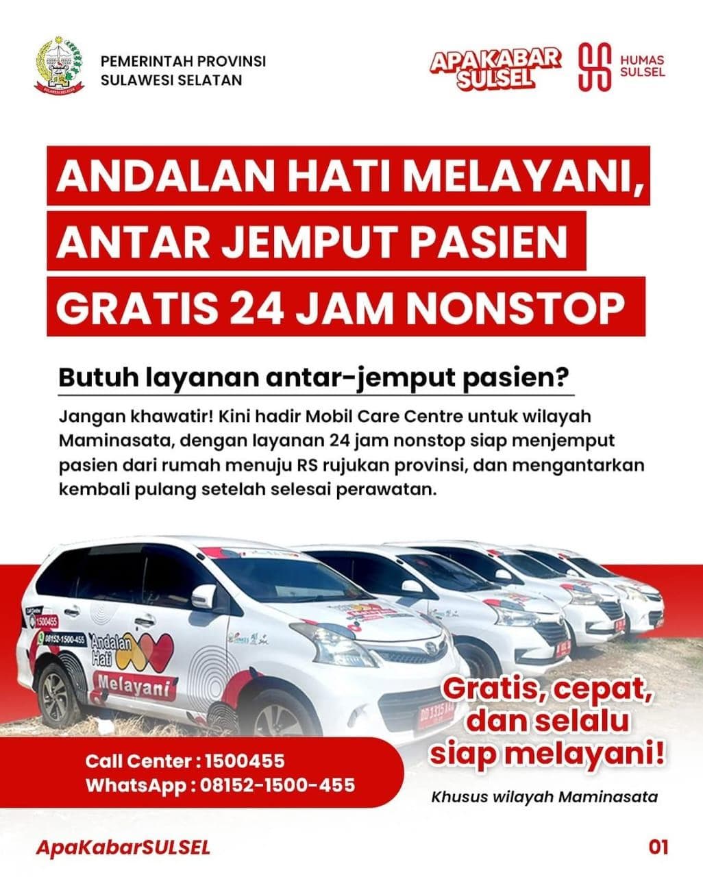 STARINDONEWS.COM, Maros – Pemerintah Provinsi Sulawesi Selatan resmi menghadirkan program Mobil Andalan Hati di Kabupaten Maros. Layanan antar-jemput pasien gratis selama 24 jam ini diharapkan mampu mempermudah masyarakat dalam mendapatkan akses kesehatan.