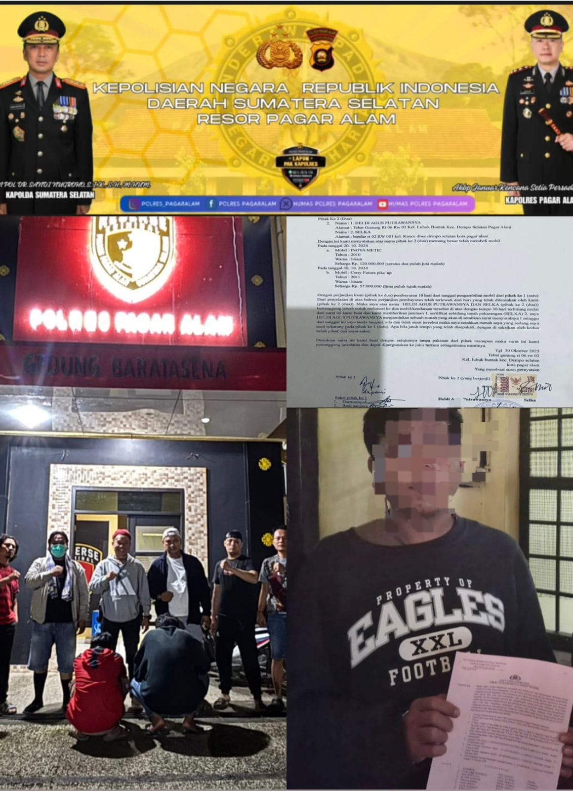 Kasus ini terungkap berdasarkan Laporan Polisi Nomor: LP/B-249/XII/2025/SPKT/Polres Pagaralam tertanggal 2 Desember 2025. Korban, Arfensi (47), warga Muara Tenang, Kecamatan Dempo Selatan, melaporkan dugaan penipuan yang dialaminya setelah dua unit mobil miliknya dibawa pelaku dengan dalih akan dijual.