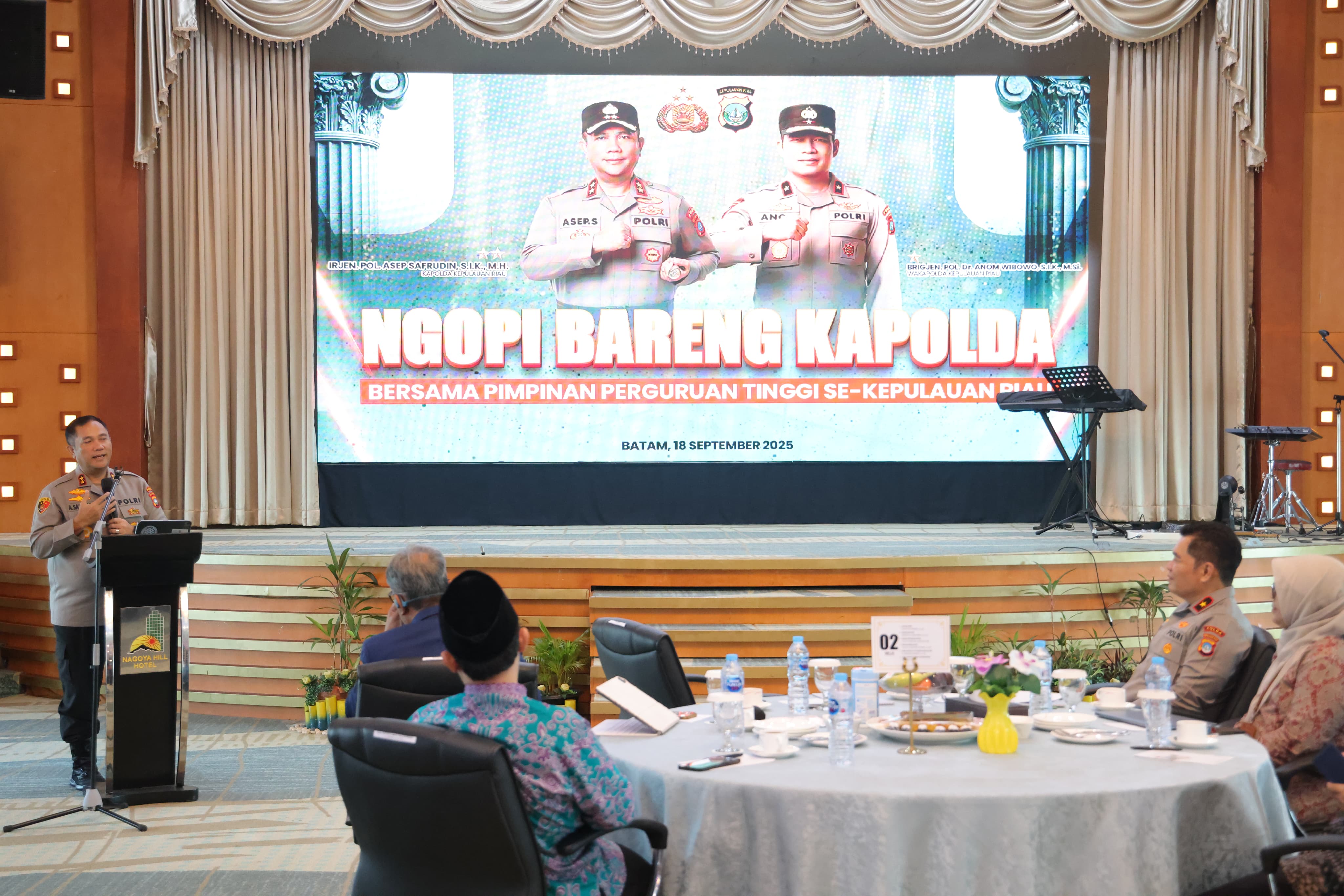 Starindonews.com Batam – Kepolisian Daerah Kepulauan Riau (Polda Kepri) menggelar kegiatan Ngopi Bareng Kapolda Kepri bersama Pimpinan Perguruan Tinggi Se-Kepri pada Kamis (18/9/2025) bertempat di Hotel Nagoya Hill, Batam.