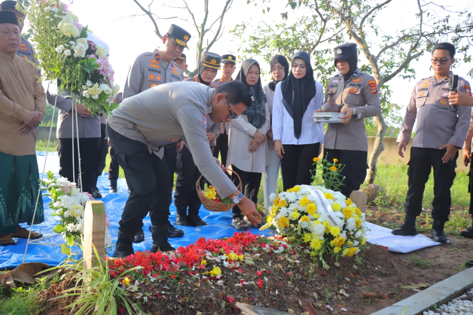 Kegiatan ini berlangsung khidmat di lokasi pemakaman almarhum, dan dipimpin langsung oleh Dir Bintibmas Baharkam Polri, Brigjen Pol M. Rudy Syarifudin, S.I.K., S.H., yang didampingi oleh Wakapolda Lampung, Brigjen Pol Dr. Ahmad Ramadhan, S.H., M.Si., M.H.