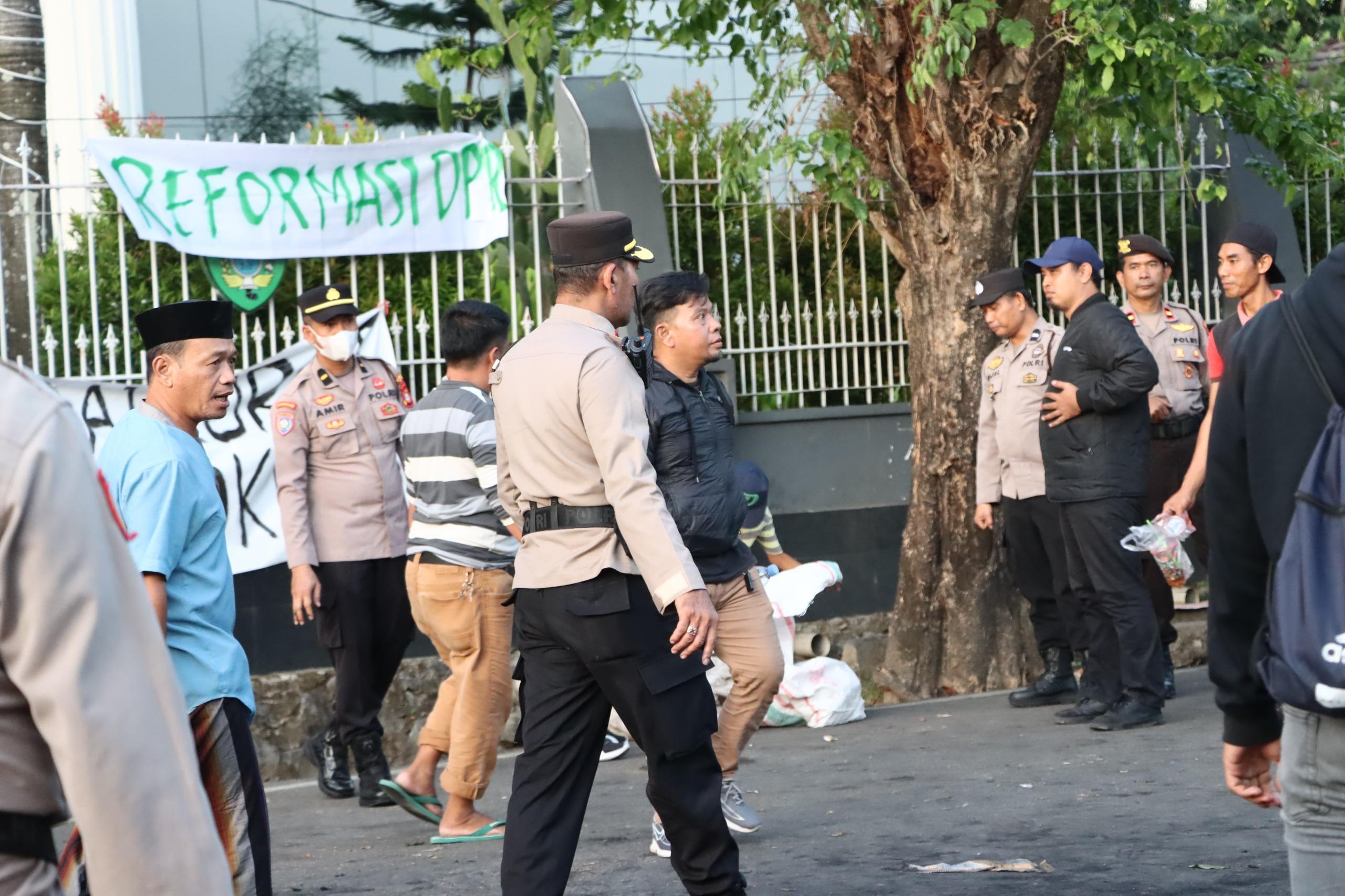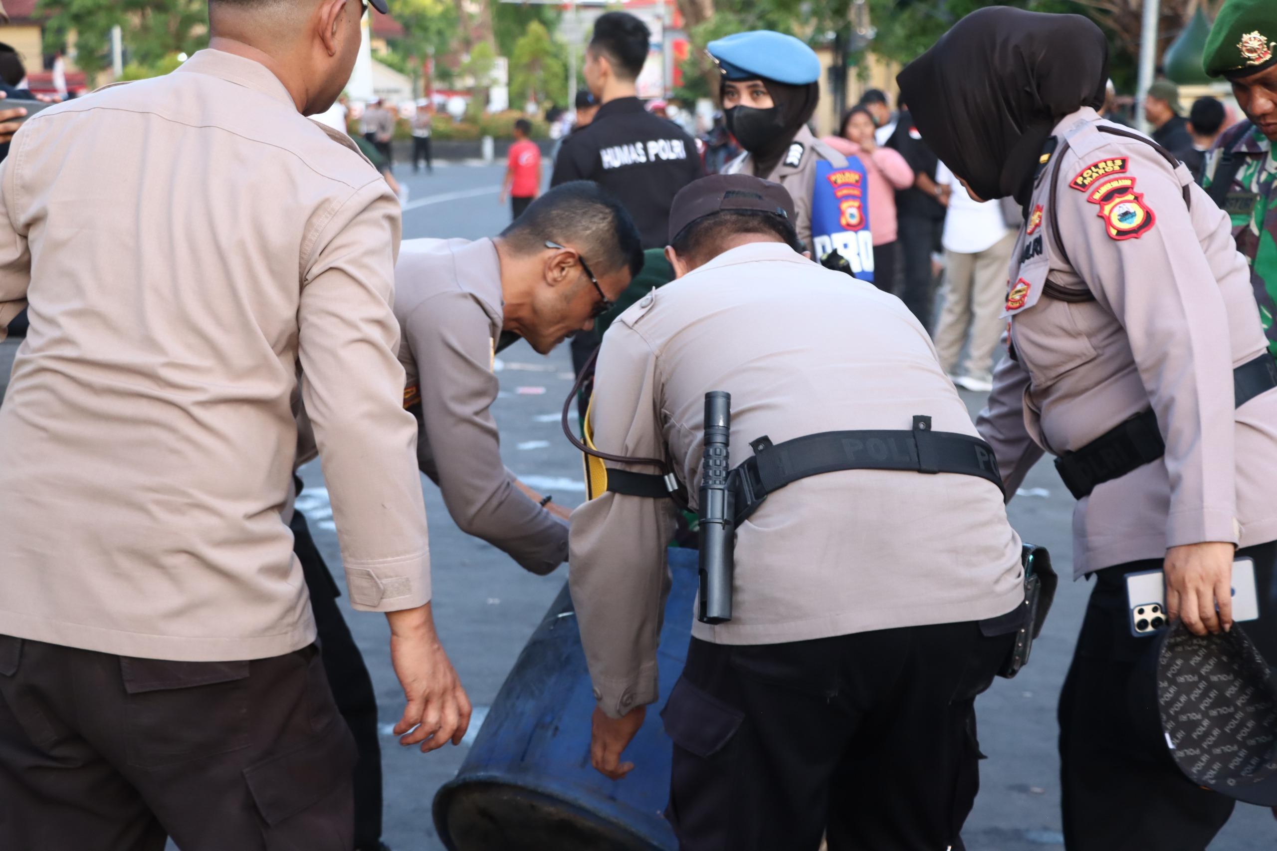 Personel tampak menyapu dan mengumpulkan sisa-sisa sampah maupun atribut unjuk rasa yang berserakan di jalan raya. Kehadiran aparat tidak hanya untuk mengamankan jalannya aksi, tetapi juga memberikan teladan dalam menjaga kebersihan serta mengembalikan kenyamanan masyarakat pasca kegiatan.