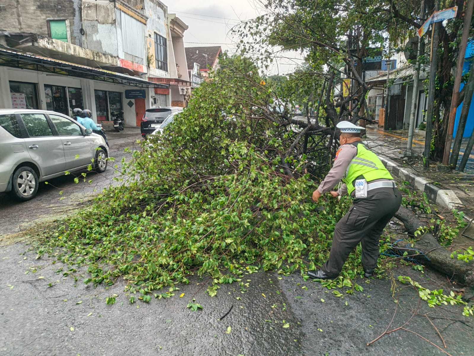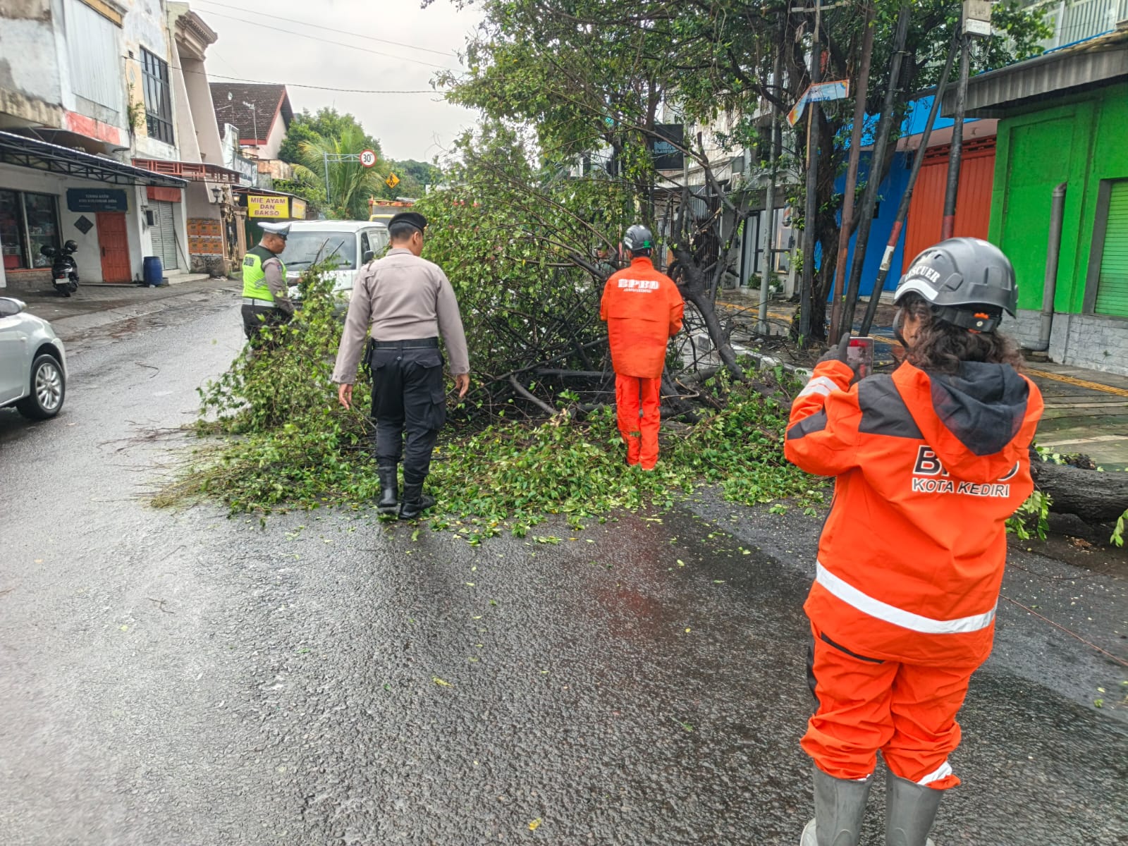 STARINDONEWS.COM | KEDIRI KOTA – Hujan yang mengguyur wilayah Kota Kediri, Jawa Timur, pada Kamis sore, 20 November 2025, menyisakan cerita tentang kesiapsiagaan aparat kepolisian di tengah kondisi cuaca yang tak menentu. Sebuah pohon tua jenis kersen atau seri/ceri (Muntingia calabura) tiba-tiba roboh di ruas Jalan Letjen Suprapto–Letjen Sutoyo, Kecamatan Pesantren. Reruntuhan batang dan ranting pohon menutup sebagian badan jalan, menyebabkan arus lalu lintas sempat tersendat.