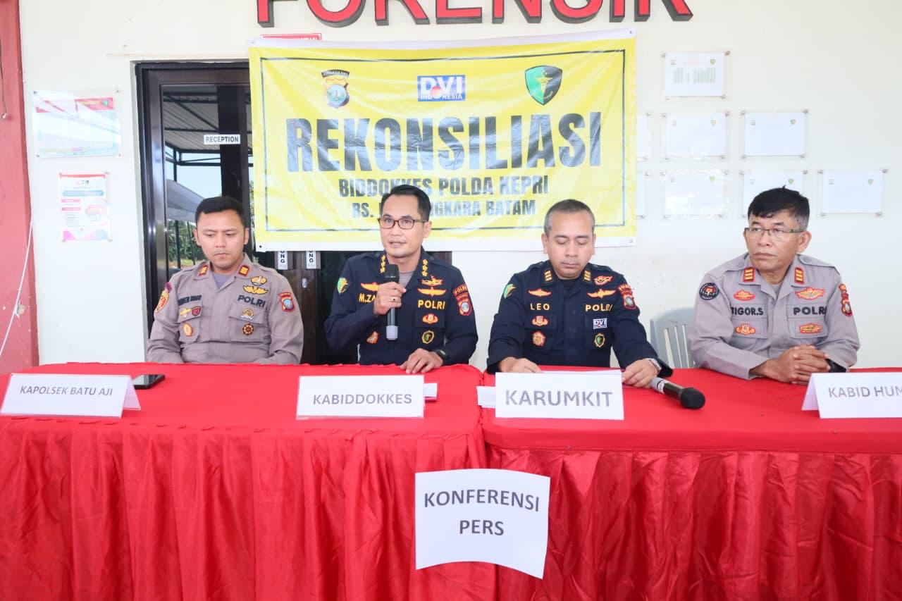 Konferensi pers dipimpin langsung oleh Kabiddokkes Polda Kepri drg. Muhammad Zakir, S.H., M.H., didampingi Ka Rumkit Bhayangkara Polda Kepri AKP Dr. dr. Leonardo, Sp.F.M., M.H., Kapolsek Batu Aji AKP Raden Bimo Dwi Lambang, S.Tr.K., S.I.K. dan Ps. Kaurpenum Subbid Penmas Bidhumas Polda Kepri AKP Tigor Sidabariba, S.H., serta Turut hadir pula perwakilan dari Bag Psikologi SDM Polda Kepri dan DVI Polda Kepri.