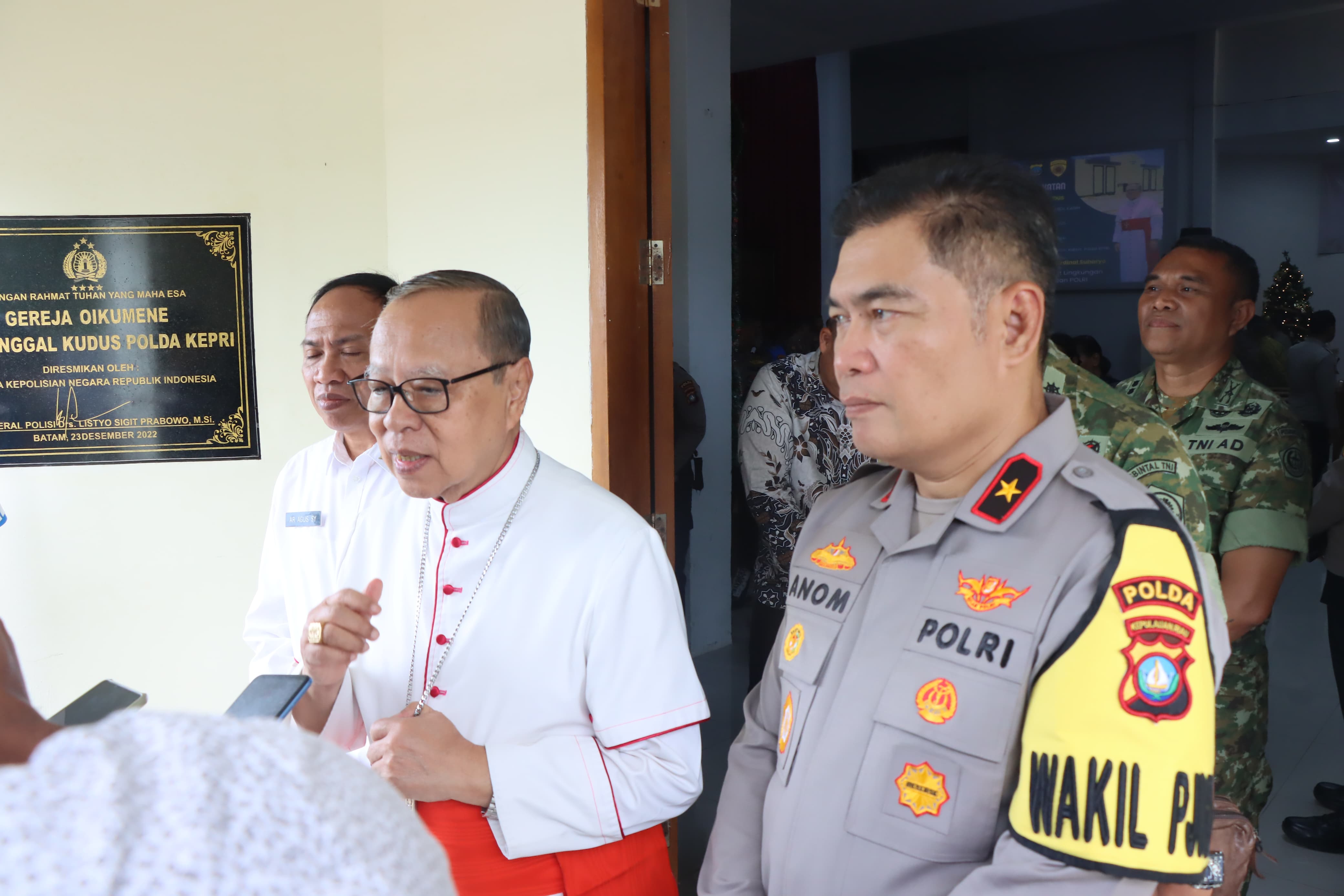 “Gereja Oikumene ini dibangun tiga tahun lalu oleh Kapolda Irjen Pol Aris Budiman yang kini telah purna. Kehadiran Bapak Kardinal di tempat ini memberikan kekhusyukan dan keberkahan bagi kami dalam mengelola Gereja Oikumene Polda Kepri.