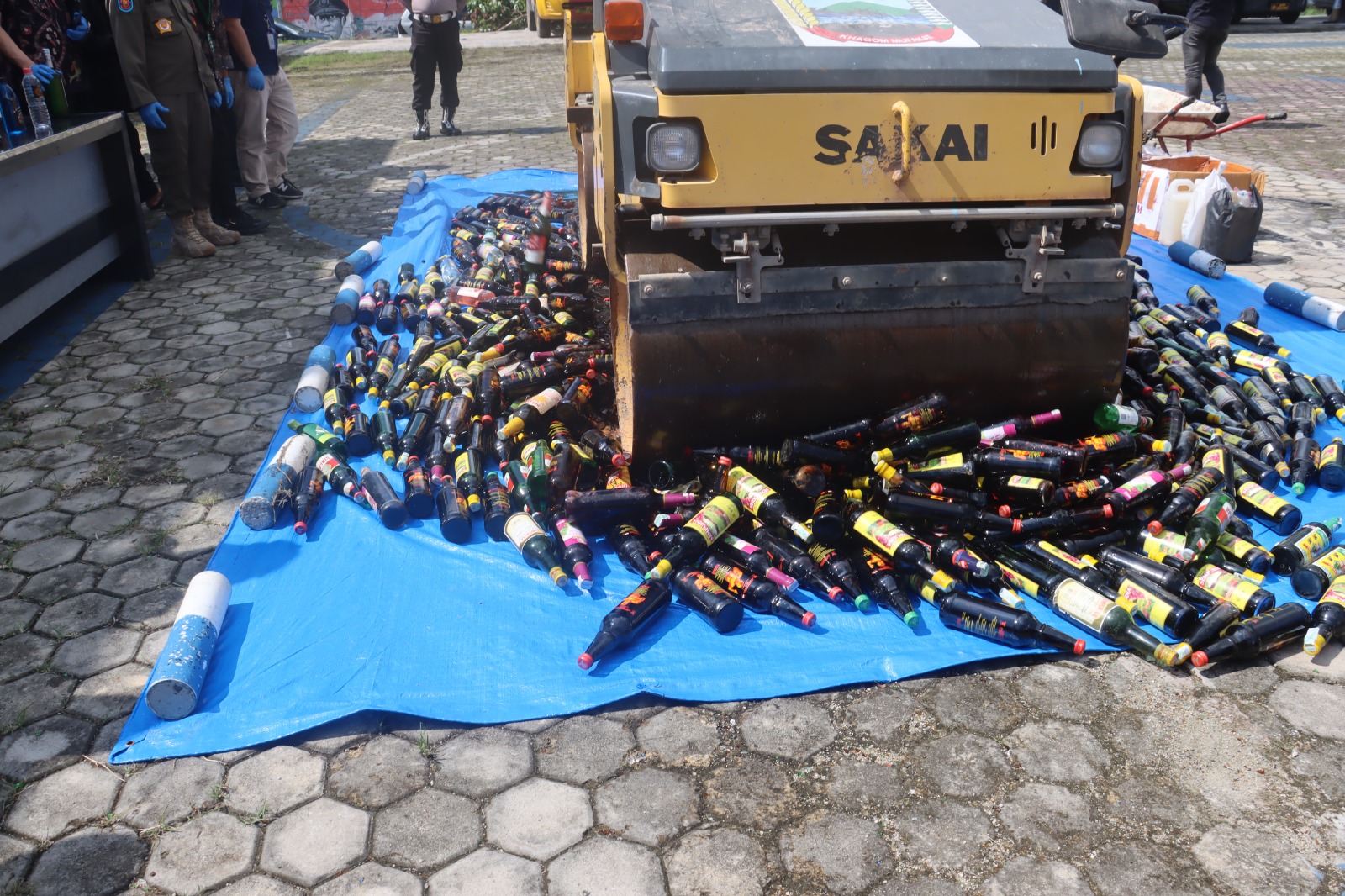 Proses pemusnahan dilakukan dengan menggilas sampai hancur botol minuman menggunakan mini road roller yang telah disiapkan, dan untuk tuak dituangkan ketanah. Seluruh proses ini diawasi dan disaksikan bersama secara ketat untuk memastikan tidak ada penyalahgunaan atau penyisihan barang bukti.