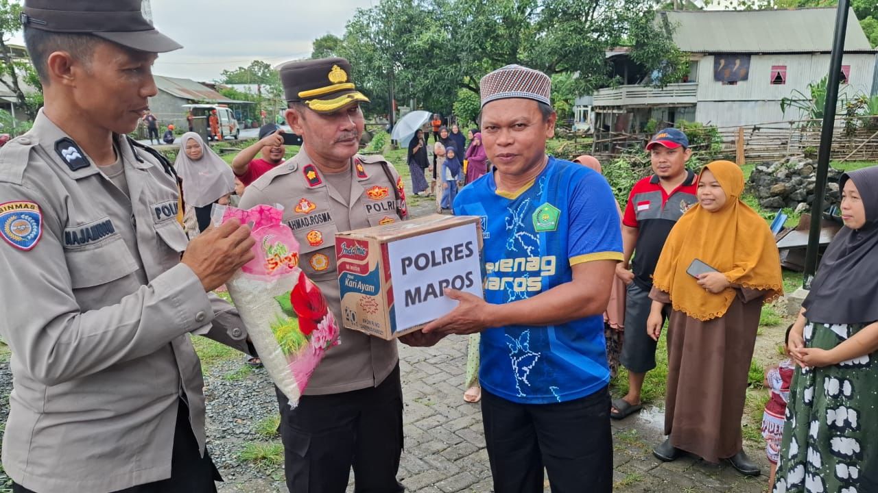 Wakapolres Maros, Kompol Ahmad Rosma, S.H., turun langsung memimpin penyaluran bantuan berupa paket sembako kepada warga yang menjadi korban. Bantuan tersebut diberikan sebagai bentuk empati dan kehadiran Polri di tengah masyarakat saat terjadi musibah.