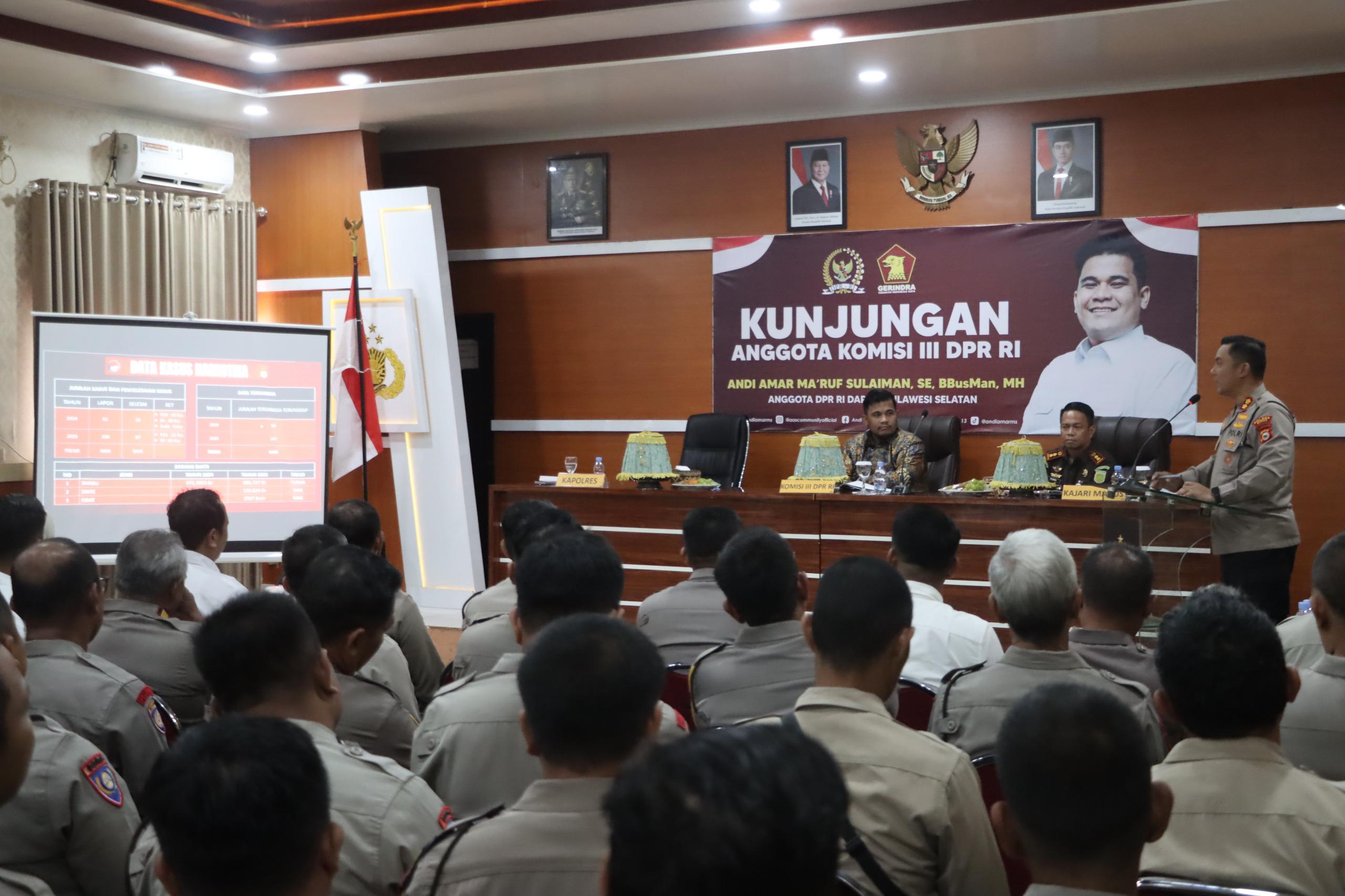 STARINDONEWS .COM, Maros, Sulsel – Kepolisian Resor Maros menerima kunjungan kerja reses dari Anggota Komisi III Dewan Perwakilan Rakyat Republik Indonesia (DPR RI) Andi Amar Ma’ruf Sulaiman. Kunjungan ini merupakan bagian dari kegiatan reses masa persidangan tahun 2025, yang bertujuan untuk menyerap aspirasi masyarakat, khususnya terkait isu hukum dan keamanan, serta meninjau langsung kinerja aparat penegak hukum di daerah.