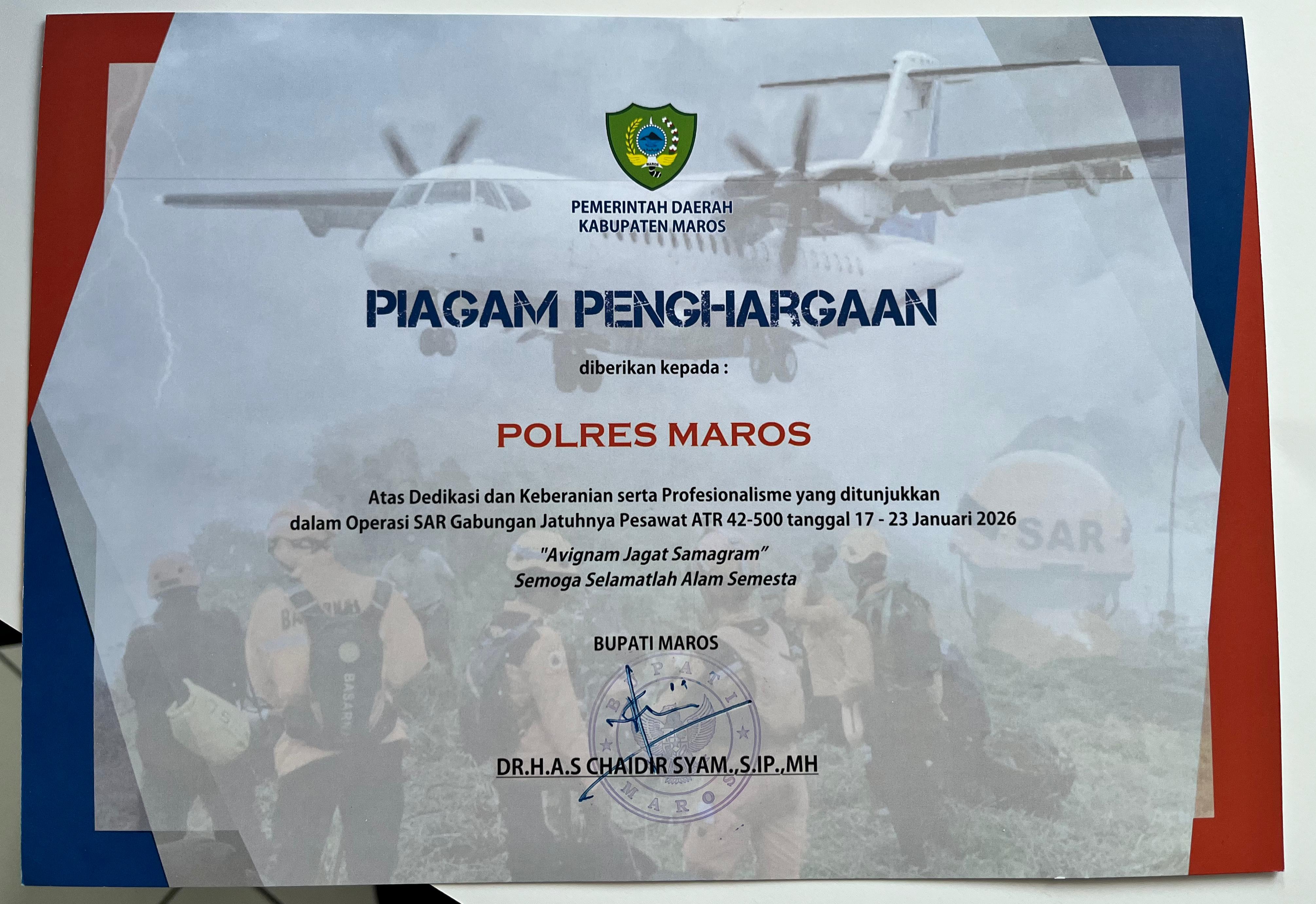 STARINDONEWS.COM, Maros – Polres Maros menerima penghargaan dari Bupati Maros atas dedikasi dan kontribusi aktif dalam pelaksanaan Operasi SAR gabungan pada peristiwa jatuhnya pesawat ATR 42-500 di wilayah Kabupaten Maros. Penyerahan penghargaan tersebut berlangsung di Lapangan Upacara Pallantikang, Kabupaten Maros, Senin (26/1/2026).