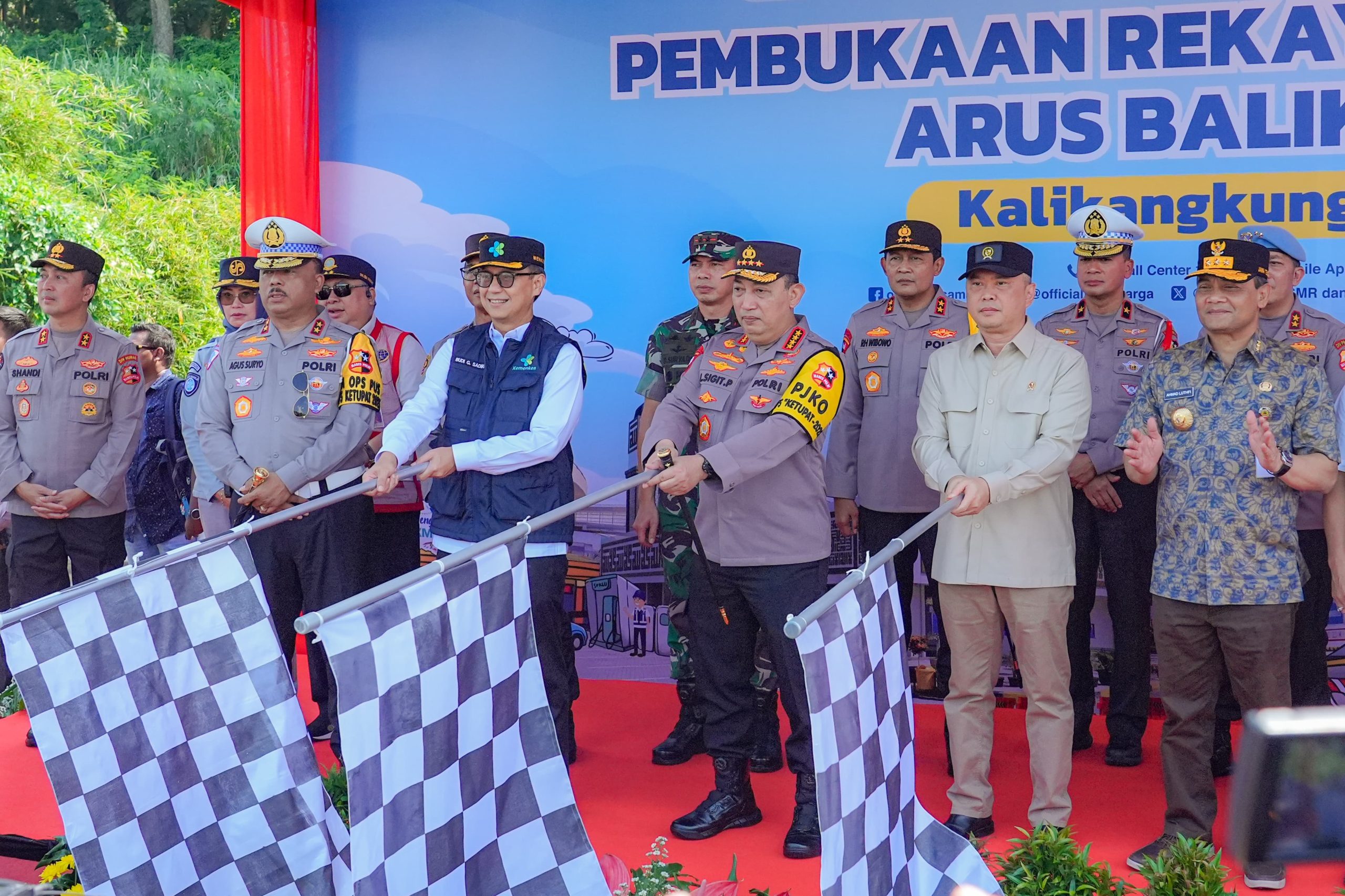 StarindoNews.com KALIKANGKUNG — Kapolri Jenderal Listyo Sigit Prabowo menghadiri dan melepas Flag Off One Way Nasional Arus Balik di KM 414 Kalikangkung sampai KM 70, Minggu (6/4/2025). Sebelumnya, Korlantas Polri telah memprediksi puncak arus balik bakal terjadi pada hari ini.