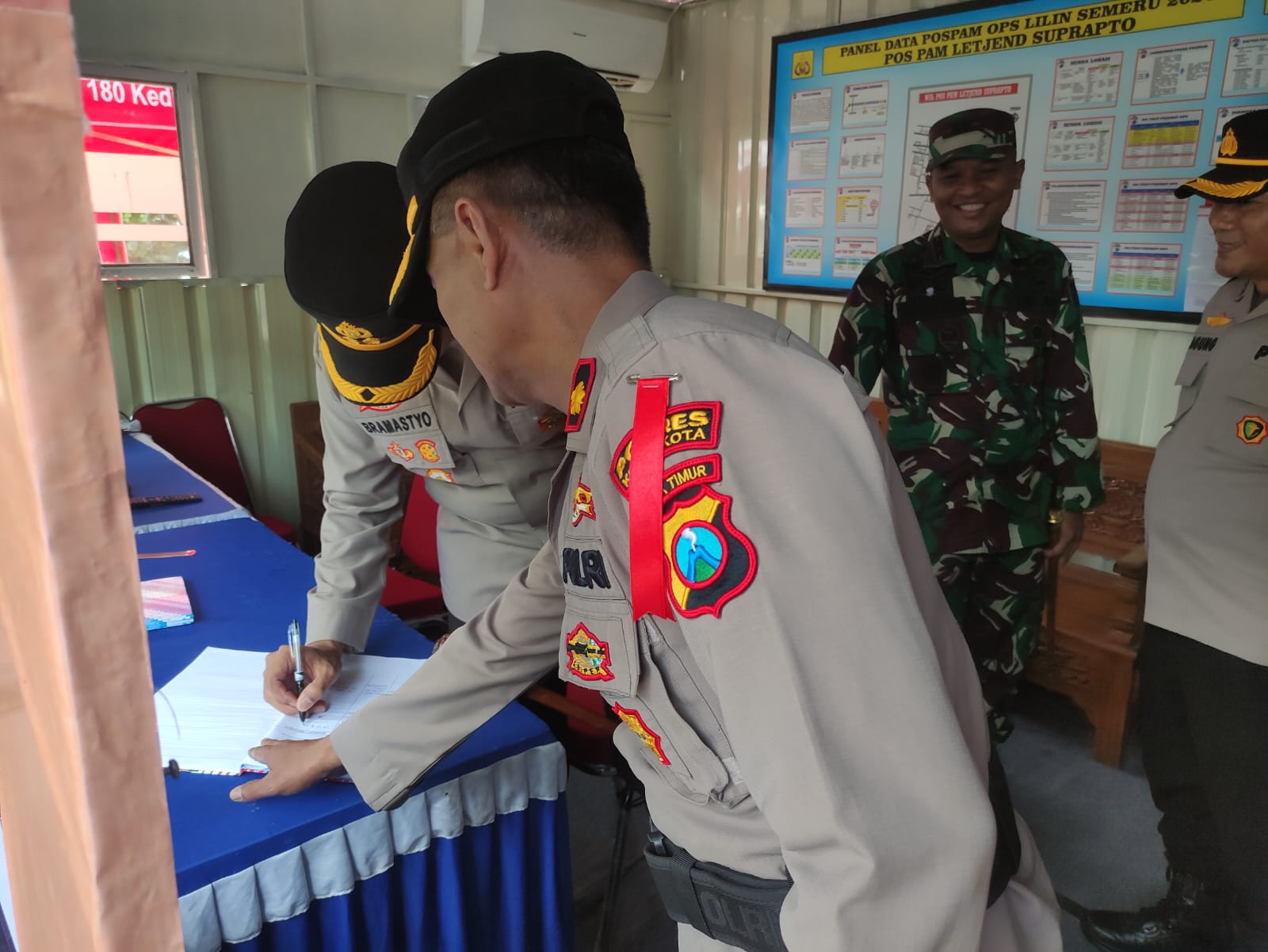 Kedatangan Kapolres Kediri Kota bersama Dandim dan Karumkit Kediri serta rombongan disambut Kapolsek Pesantren Kompol Siswandi, Kapospam AKP Dedi Sukirno, Perwira Pengendali ( Padal ) Ipda Suwondo, serta para personel yang bertugas pada Pospam.