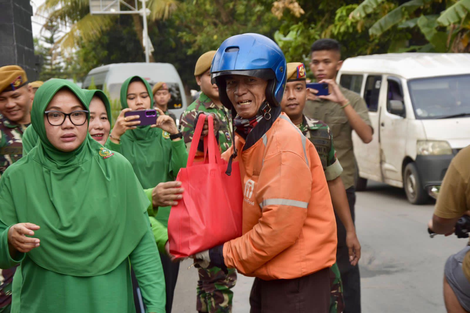 Program Jumat Berkah ini bertujuan untuk membantu masyarakat sekitar dengan pembagian makanan gratis kepada warga yang membutuhkan, Prajurit Resimen Arhanud 1/Falatehan Dan anggota Persit menyerahkan bantuan kepada Warga sekitar yang membutuhkan, Pesanggrahan, Jakarta Selatan, Jumat(09/05/2025)