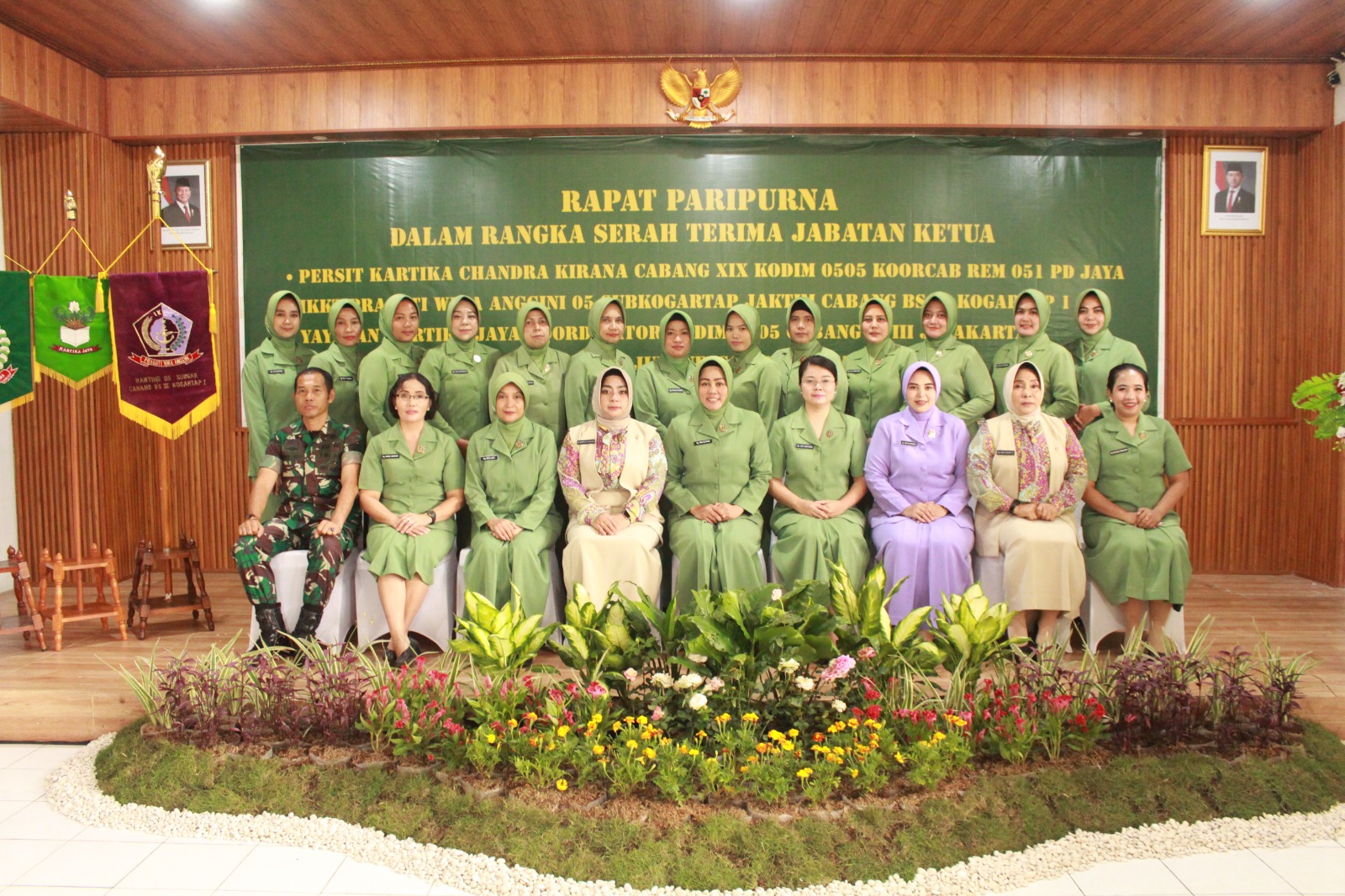 StarindoNews.com JAKARTA -– Persit KCK Cabang XIX Kodim 0505/JT menggelar Rapat Paripurna dalam rangka Serah Terima Jabatan Ketua Persit KCK Cabang XIX Kodim 0505/JT Koorcab Rem 051 PD Jaya bertempat di Aula Makodim, Rapat Paripurna dipimpin Ketua Persit KCK Cabang XIX Kodim 0505/JT Ny. Rini Suyikno, Kamis (01/05/25).