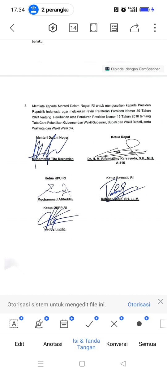 Kemudian pada Point ke 2, pelantikan Gubernur dan Wakil Gubernur,Bupati dan Wakil Bupati, Walikota dan Wakil Walikota terpilih dari hasil pemilihan serentak nasional tahun 2024 yang masih dalam proses sengketa perselisihan hasil pemilihan di Mahkamah Konstitusi RI akan dilaksanakan setelah Putusan Mahkaah Konstitusi RI berkekuatan Hukum. Sesuai dengan peraturran perundang undangan yang berlaku.