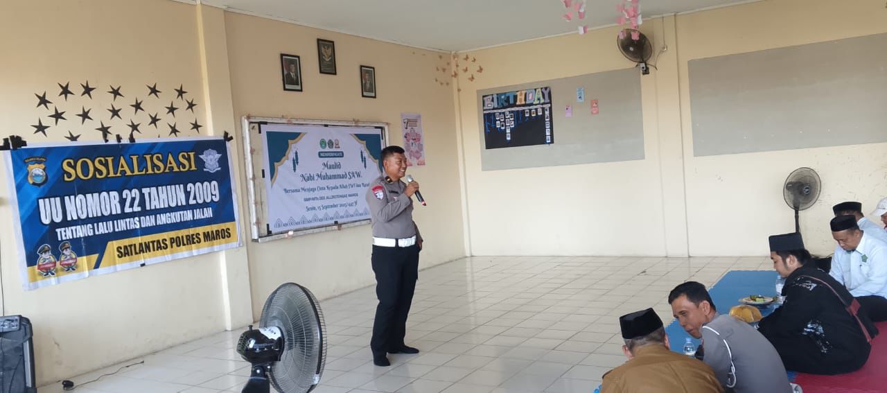 STARINDONEWS,COM. Maros – Satuan Lalu Lintas (Sat Lantas) Polres Maros melaksanakan kegiatan sosialisasi Undang-Undang Nomor 22 Tahun 2009 tentang Lalu Lintas dan Angkutan Jalan kepada para siswa SMP/MTS DDI Alliritengae, Senin (15/9)