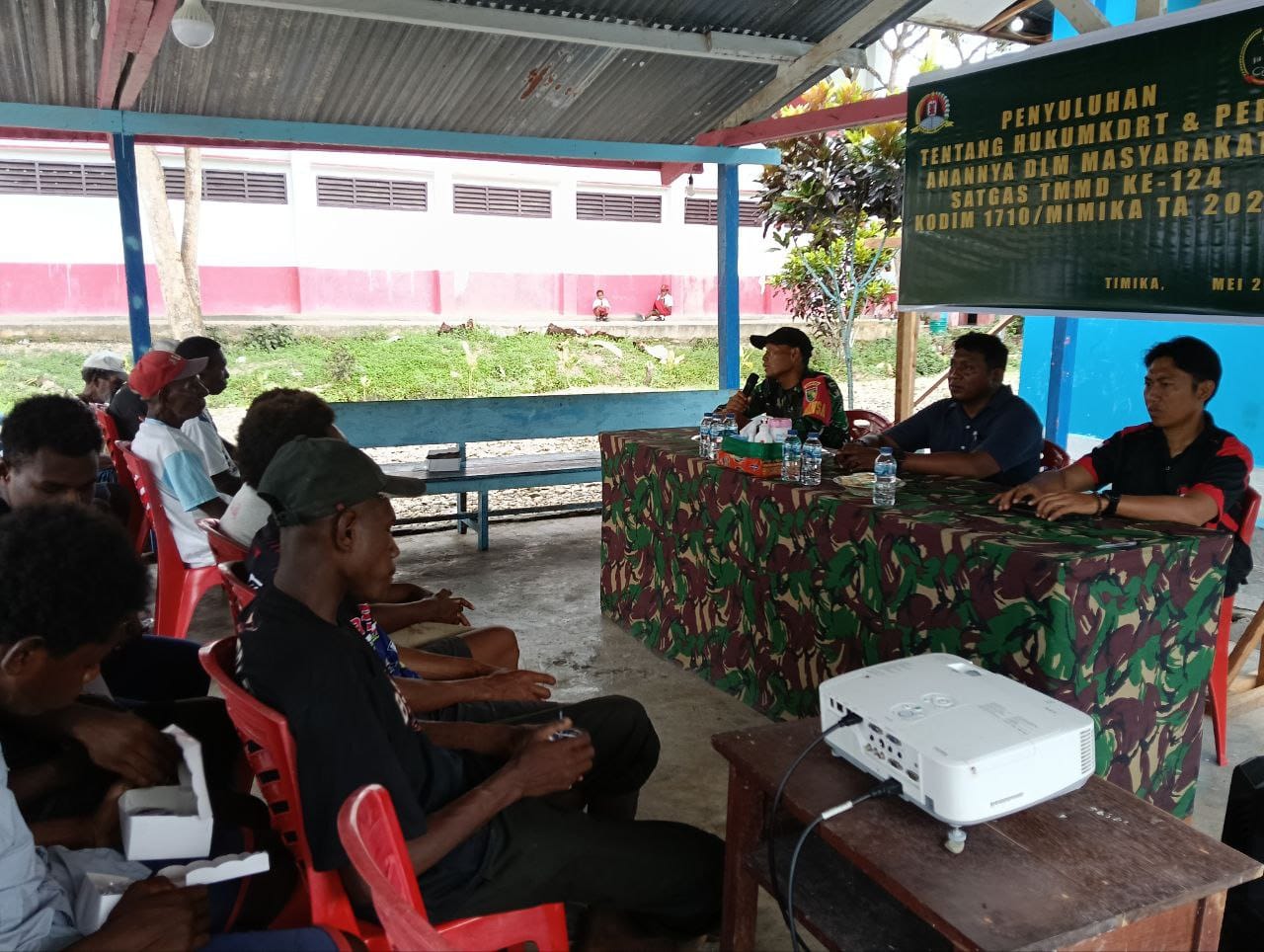 StarindoNews.com TIMIKA — Satuan Tugas TNI Manunggal Membangun Desa (Satgas TMMD) Ke-124 Kodim 1710/Mimika menggelar kegiatan penyuluhan hukum dengan tema “Pencegahan Kekerasan dalam Rumah Tangga (KDRT) dan Peranan Hukum dalam Kehidupan Masyarakat” di Kampung Pigapu, Distrik Iwaka, Kab. Mimika. Kamis (22/5/2025).