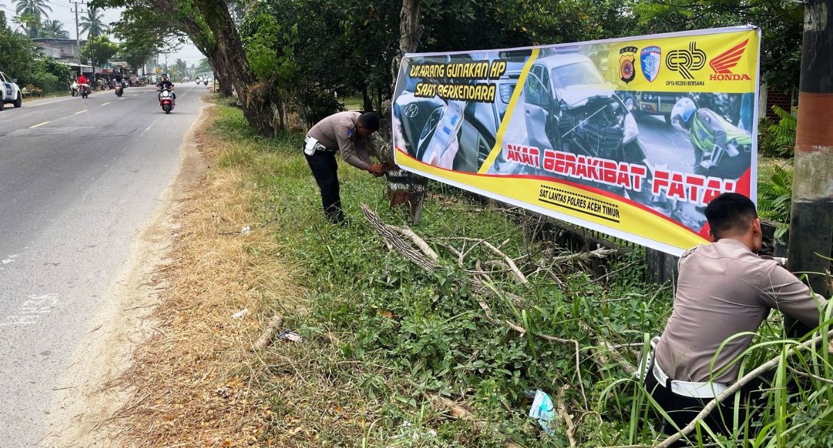 Aceh Timur-Starindonews.comSabtu 15 Frebruary 2025.Siang itu di sejumlah ruas Jalan Medan – Banda Aceh, sejumlah anggota Sat Lantas Polres Aceh Timur, Polda Aceh memasang spanduk besar bertuliskan “Operasi Keselamatan Seulawah 2025.” Beberapa warga yang melintas tampak memperhatikan, sebagian lagi mendekat untuk membaca sosialisasi yang diberikan.