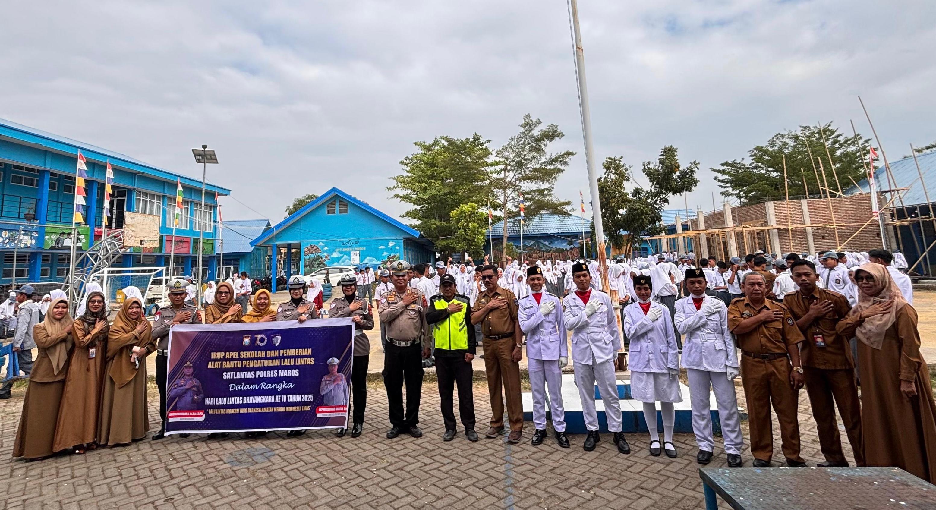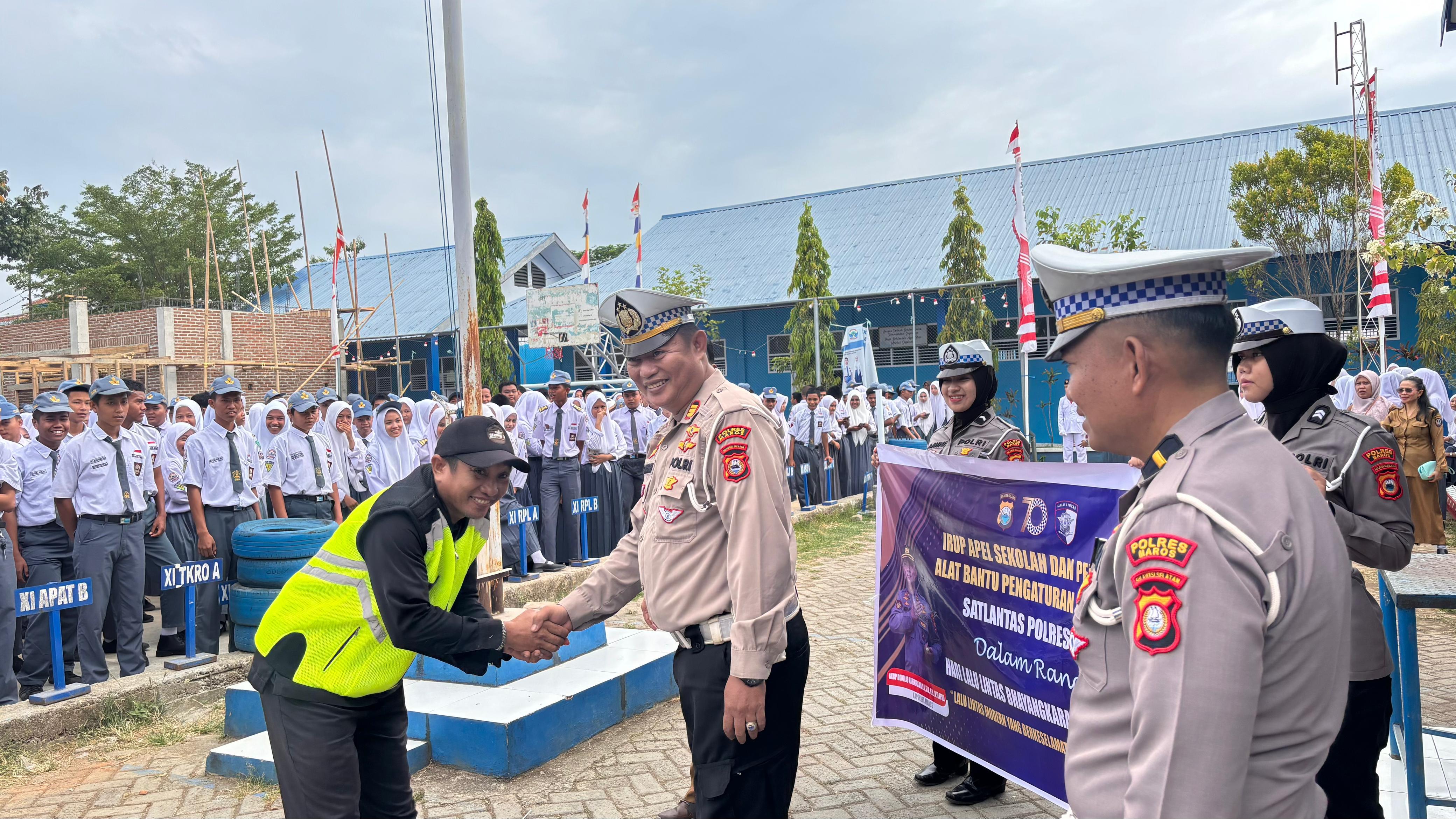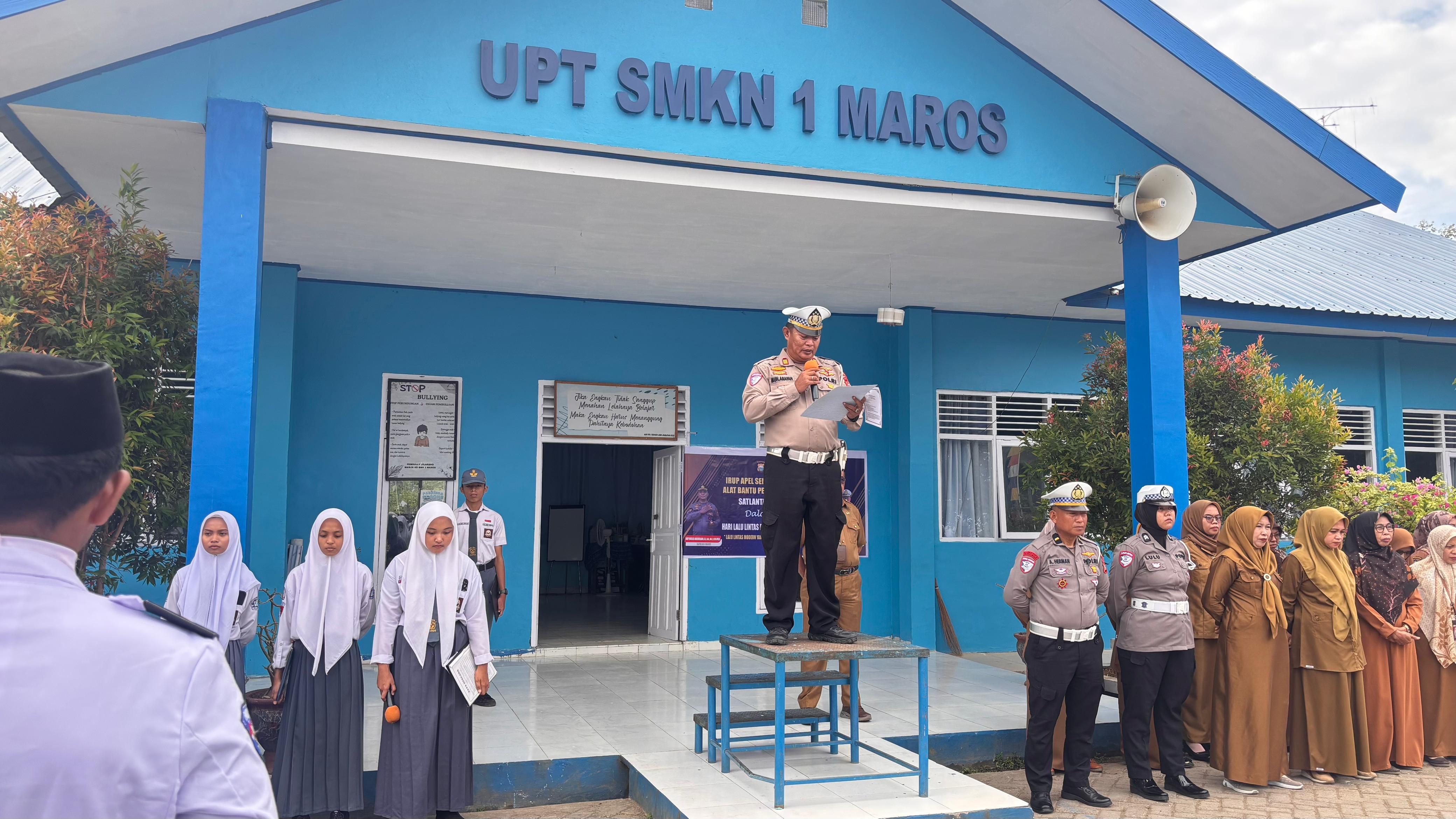 STARINDONEWS.COM,  Maros – Dalam rangka memperingati Hari Ulang Tahun Lalu Lintas Bhayangkara ke-70, Satlantas Polres Maros melaksanakan kegiatan Police Go To School di SMKN 1 Maros, Senin (8/9) pagi. Kegiatan ini dipimpin langsung oleh Kasat Lantas Polres Maros, AKP Muhammad Arafah, S.I.P, bersama sejumlah personel Satlantas.
