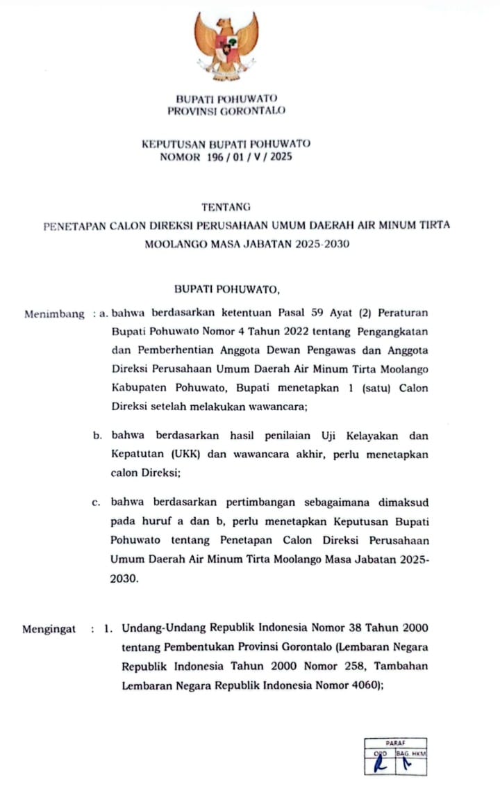 Untuk menjaga marwah Kepemimpinan Pemerintahan Bupati Saipul A. Mbuinga dan Wakil Bupati Iwan S. Adam, agar Surat Keputusan Bupati Pohuwato No. 196/01/V/2025 tentang penetapan calon Direksi PDAM Tirta Moolango masa jabatan 2025 – 2030 agar dibatalkan serta proses seleksi calon Direktur PDAM Tirta Moolango juga dibatalkan dan dibuka kembali untuk proses seleksi calon direktur yang baru karena dalam penetapannya sudah dari awal cacat aturan karena pihak panitia tidak jeli untuk memeriksa apa yang menjadi disyartkan sehingga meloloskan peserta yang tidak memenuhi syarat. (Ar).