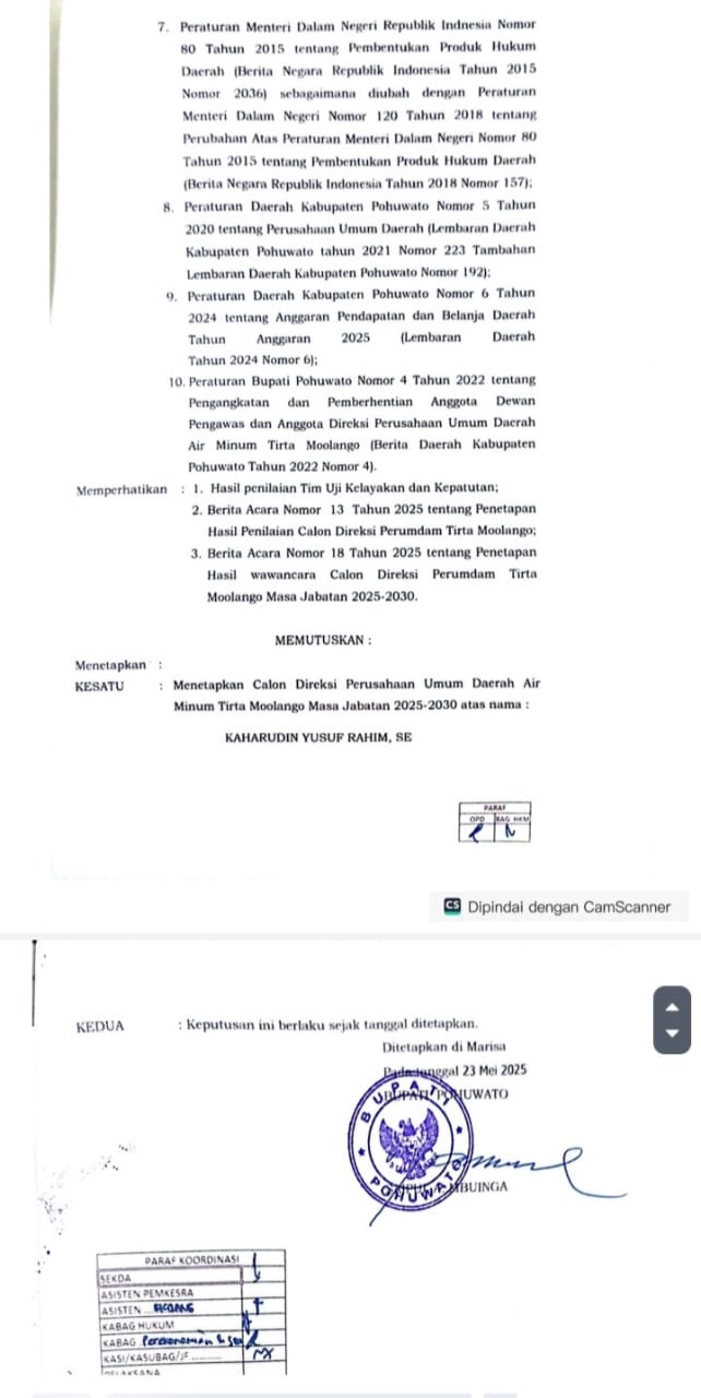 Namun apa yang terjadi salah satu peserta seleksi Saudara Kaharudin Yusuf Rahim, SE calon Direktur yang ditetapkan oleh Bupati Pohuwato berdasarkan Kepurusan Bupati Pohuwato Nomor. 196/01/V/2025 bahwa yang bersangkutan lahir tertanggal 01 Januari 1970 jika kita hitung umur yang bersangkutan Saudara Kaharudin Yusuf Rahim, SE sejak tanggal pendaftaran umurnya 55 tahun 3 bulan 27 hari.