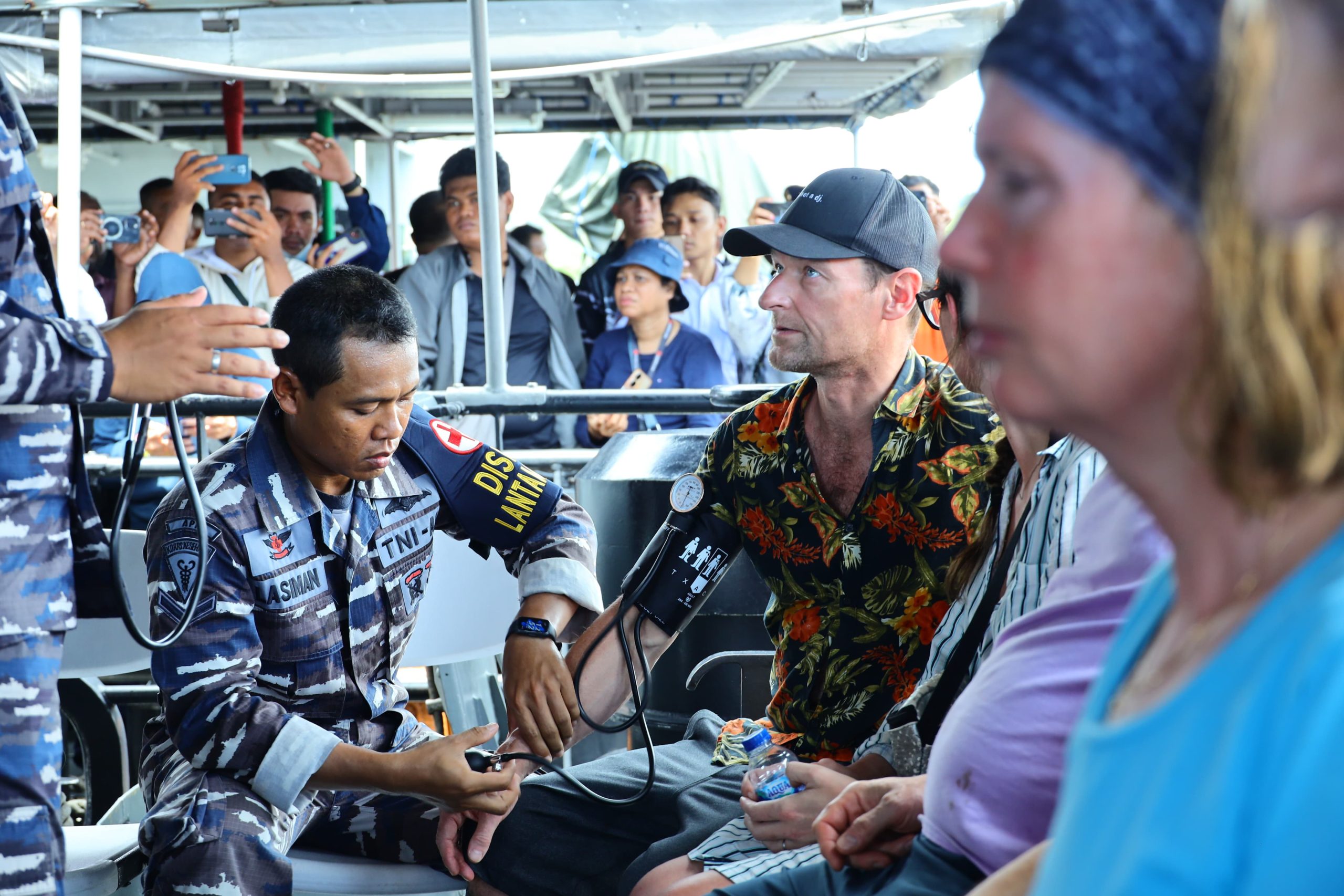 Prajurit TNI AL berhasil melaksanakan evakuasi sebanyak 17 orang anak buah kapal (ABK) yang terdiri 8 orang WNI dan Penumpang 9 orang. Dari 9 penumpang 3 orang WNI, 6 orang WNA), dari korban yang diselamatkan sebanyak 2 orang ABK cedera (1 orang kuku tercabut, 1 orang trauma reruntuhan kapal).