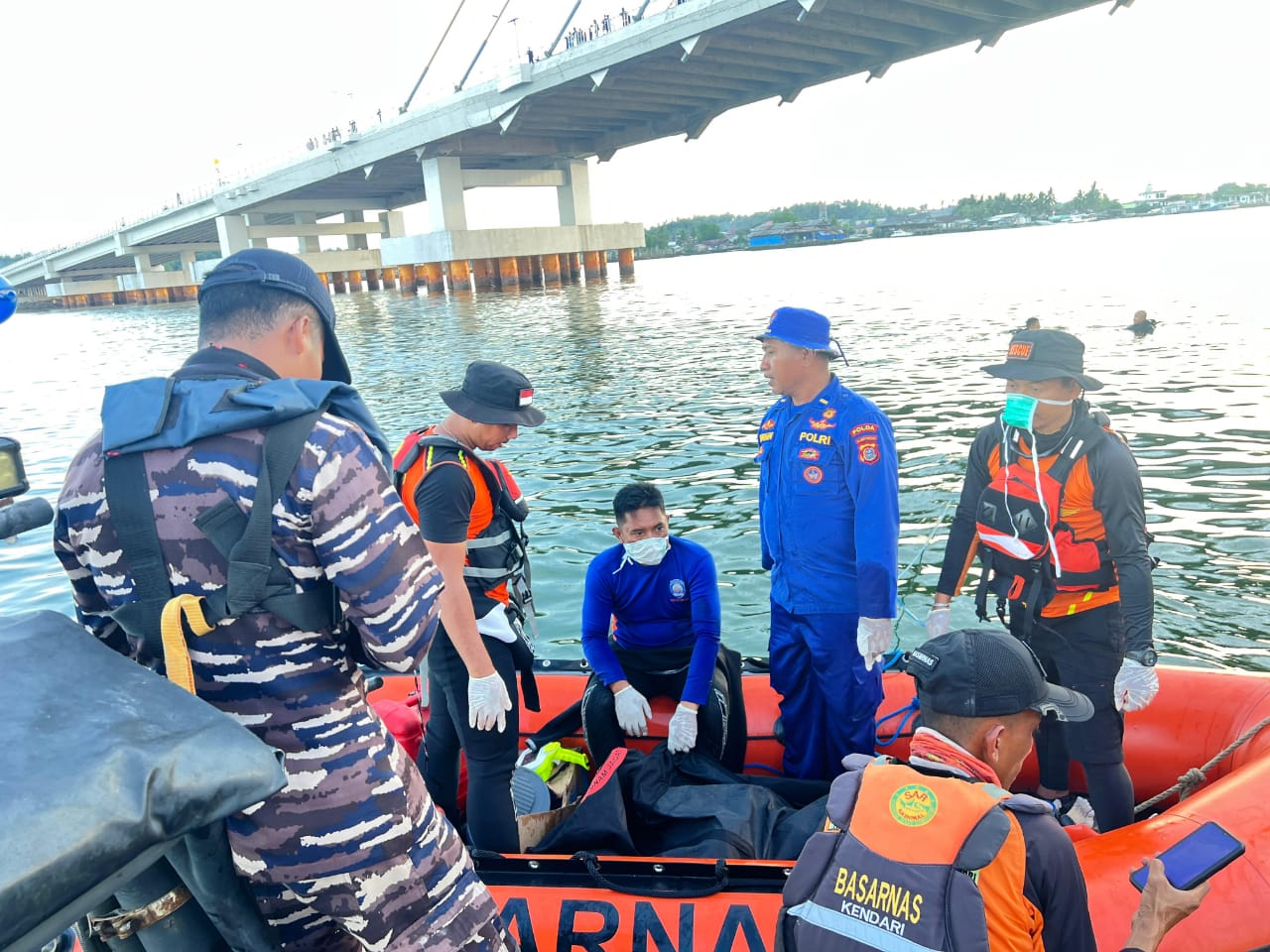 StarindoNews.com KENDARI — Prajurit TNI AL dalam hal ini Pangkalan TNI AL (Lanal) Kendari bersama Tim SAR gabungan berhasil menemukan dan mengevakuasi jasad wanita yang diduga tewas karena bunuh diri di Jembatan Teluk Kendari. Senin (28/4/25).