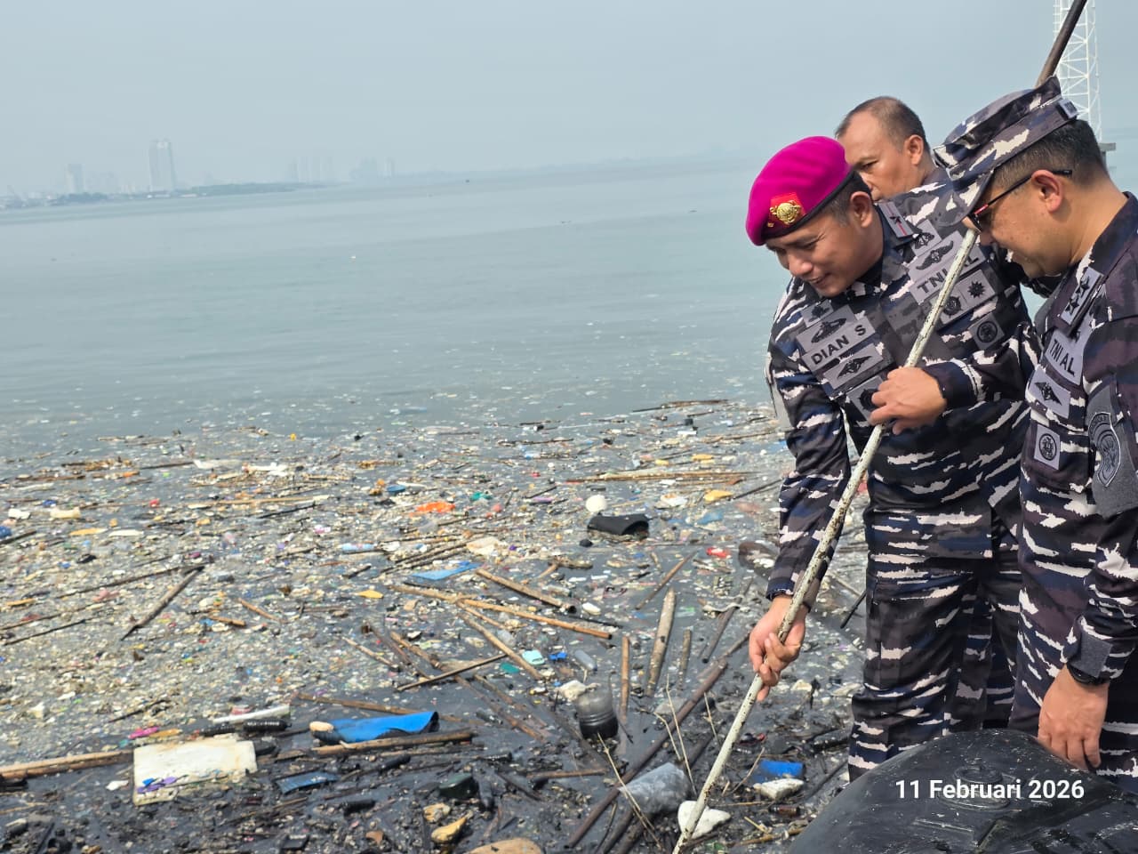 Mewakili Komandan Kodaeral III, Laksamana Muda TNI Uki Prasetia, S.T., M.M., Wakil Komandan (Wadan) Kodaeral III Brigjen TNI (Mar) Dian Suryansyah, S.E., M.Tr.Hanla., memimpin prajurit Jalasena Kodaeral III ikut terjun langsung dalam aksi bersih-bersih pantai di kawasan Dermaga Pondok Dayung, Tanjung Priok, Jakarta Utara, Rabu (11/2).